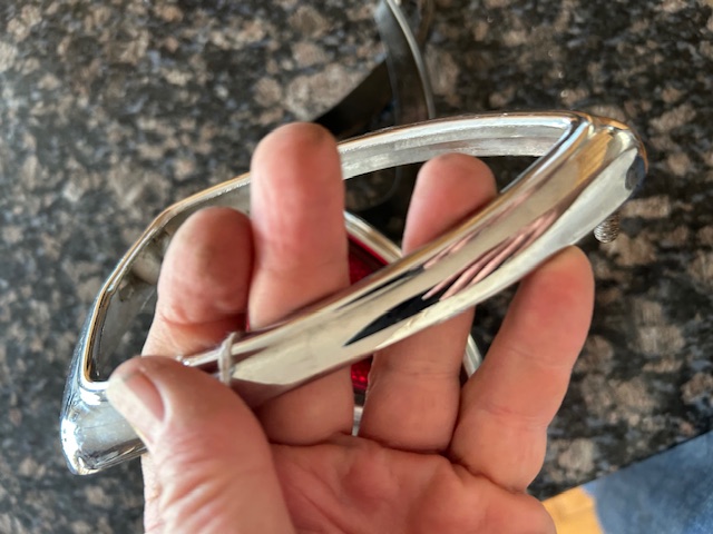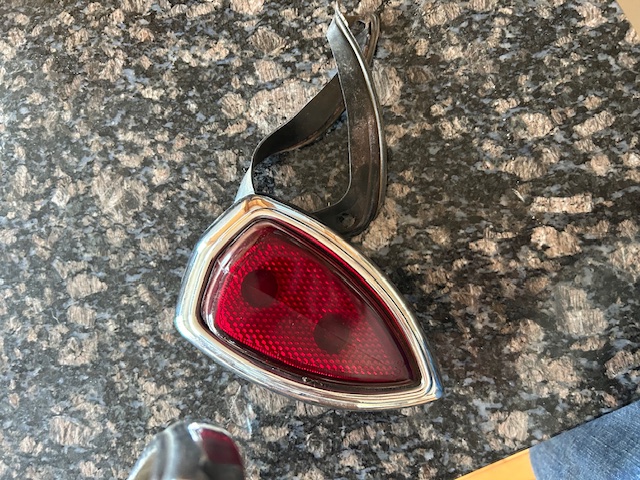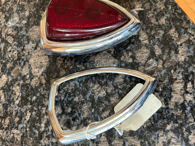 I need the tail light frames, headlight rings and a hood ornament with the brass triangle.