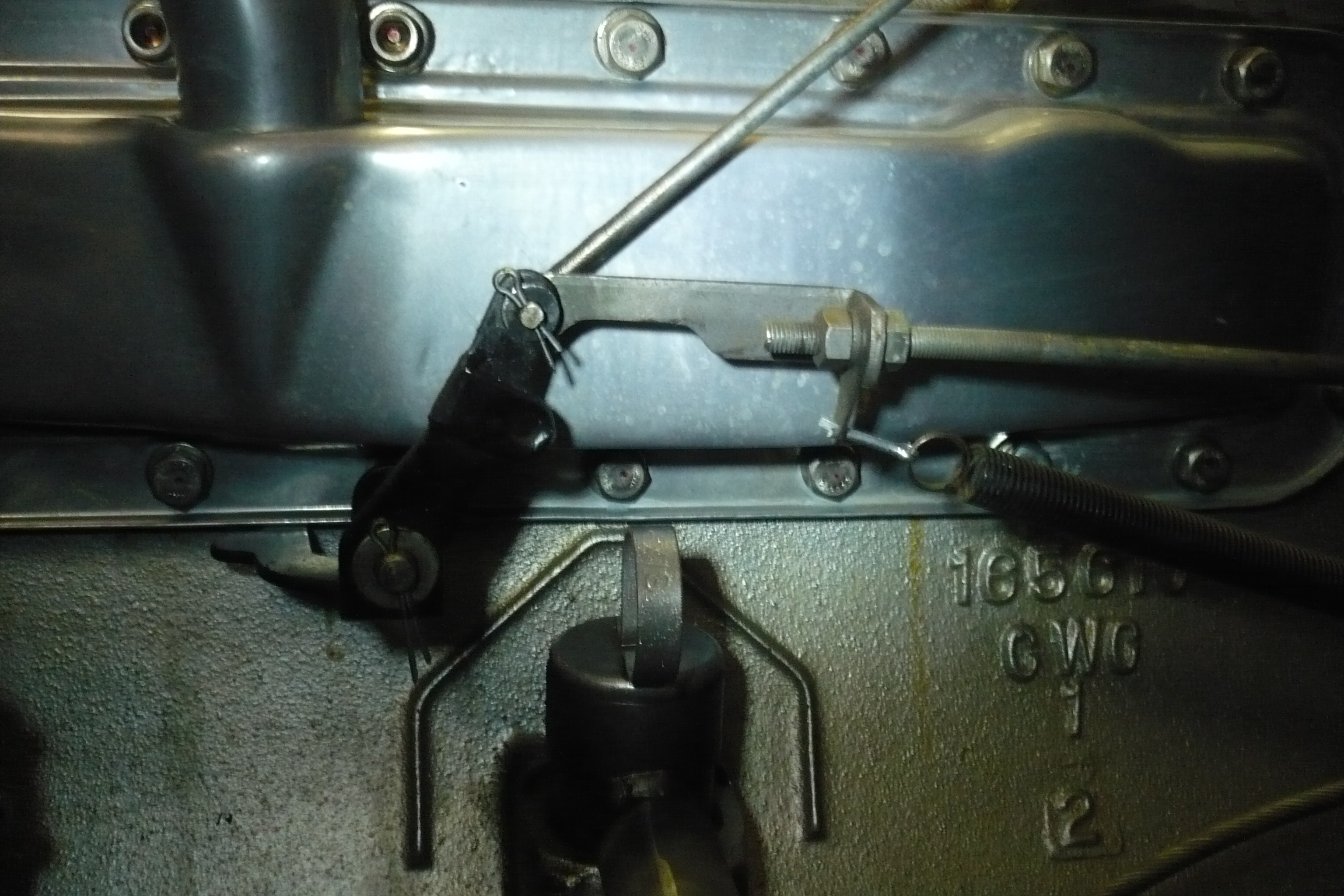 I can't figure out what I have done wrong in setting up the throttle linkage. As you can see from the attached photo, the rod on the left side of the engine pulls that arm through almost 90 degrees of rotation before it contacts the adjustment screw on the bellcrank.  From all the grime on the threaded part of the throttle rod, I can see that the adjustment hasn't changed in years, so either I have connected the pieces wrong, or the throttle rod has been adjusted wrong for a very long time. (It doesn't actually look like there is enough thread to compensate for the huge amount of travel that has to happen before the bellcrank is engaged.)