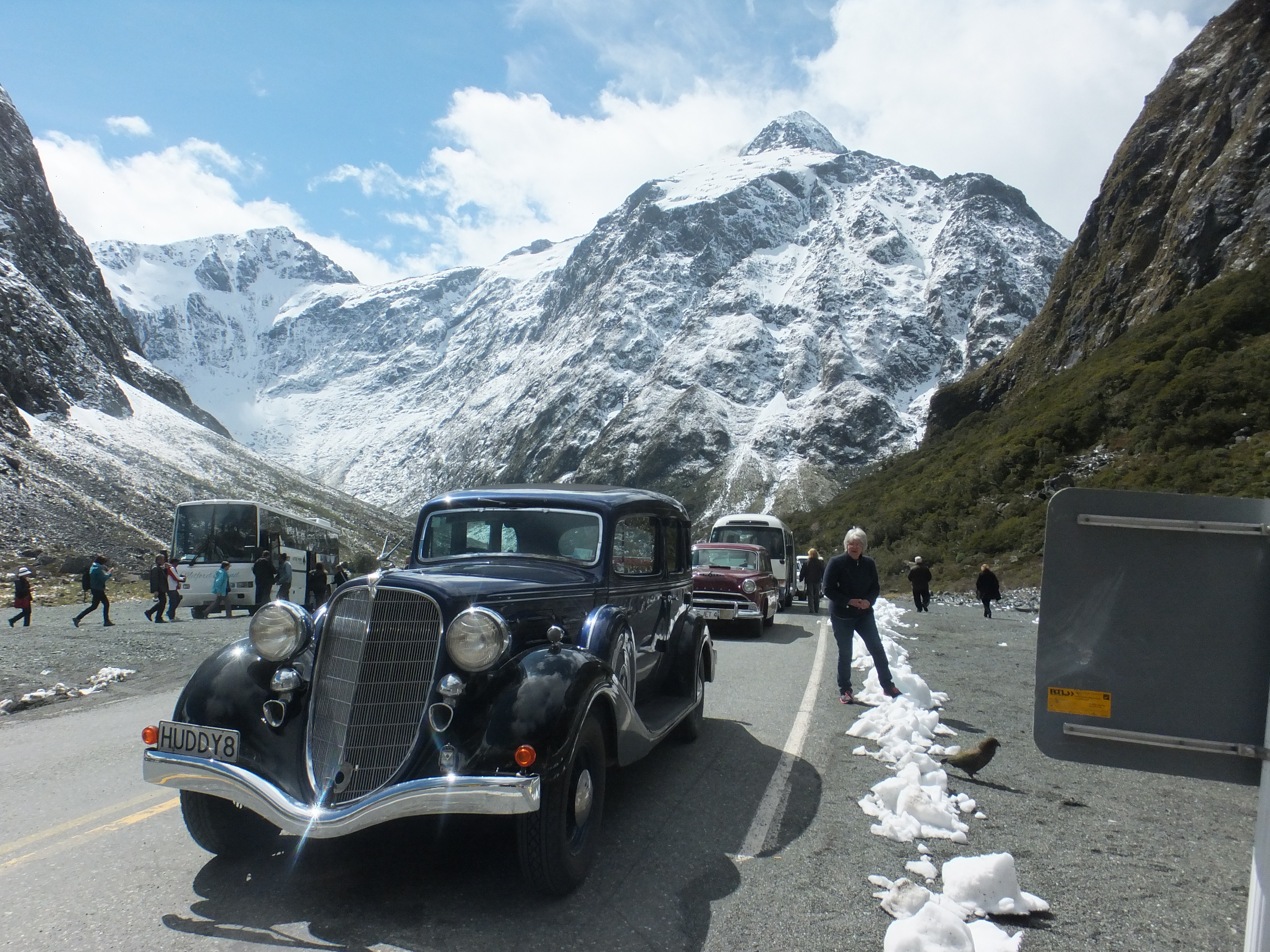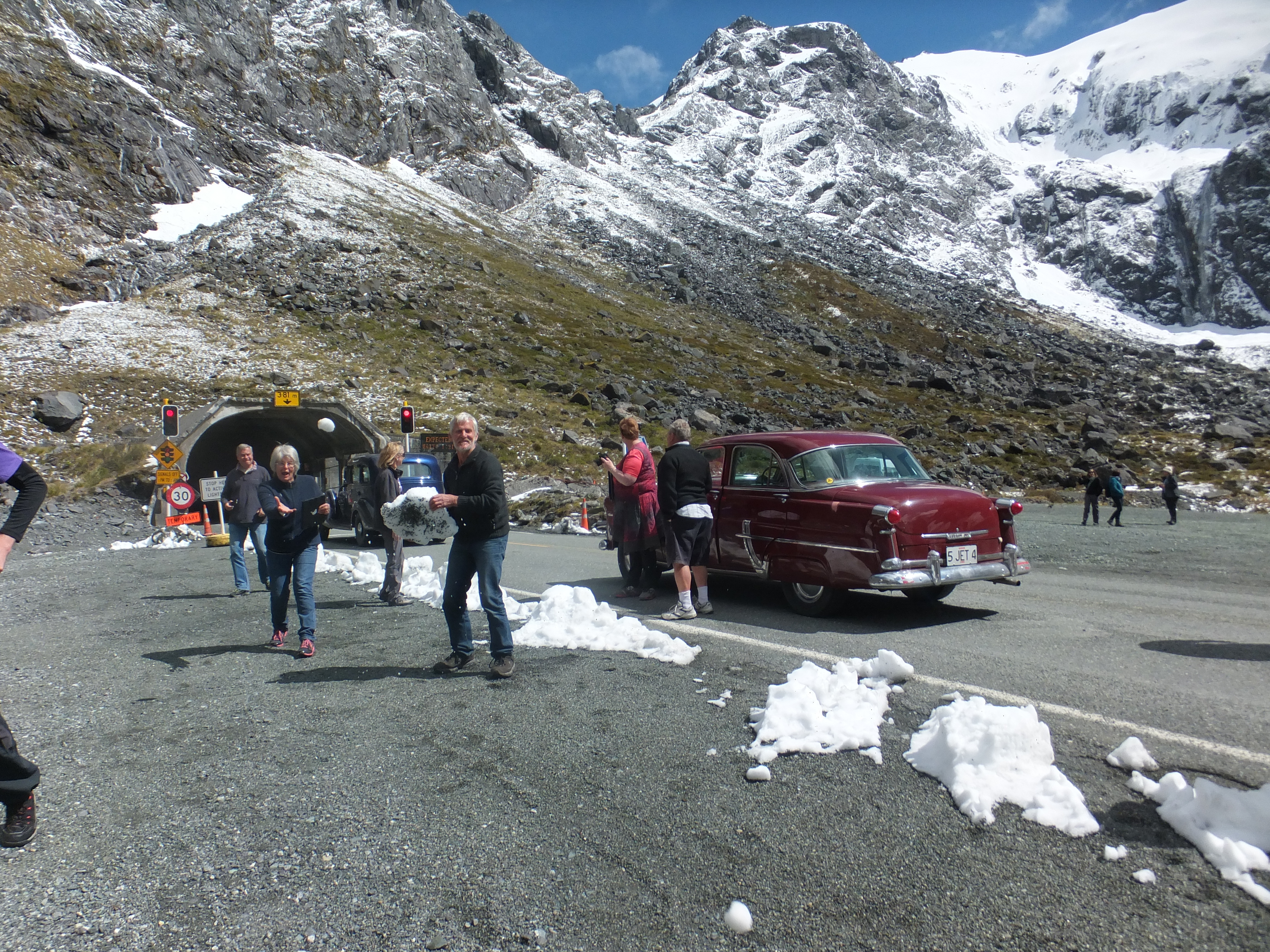 Hi folks I just thought you might be interested in some photos of or clubs annual road trip. We have just completed a 500 mile road trip into some of NewZealands most rugged and scenic areas on the wild west coast of the South Island. The following are pictures of our cars on a mountain pass waiting to go though a tunnel to Milford sound (Google it) The first picture is of club member Tony Mallards 34 Hudson 8. The second is a picture taken through the front screen of my 37 Terraplane coupe coming up to the tunnel and the third is of members playing in the snow and a picture of our NewZealand presidents Hudson Jet