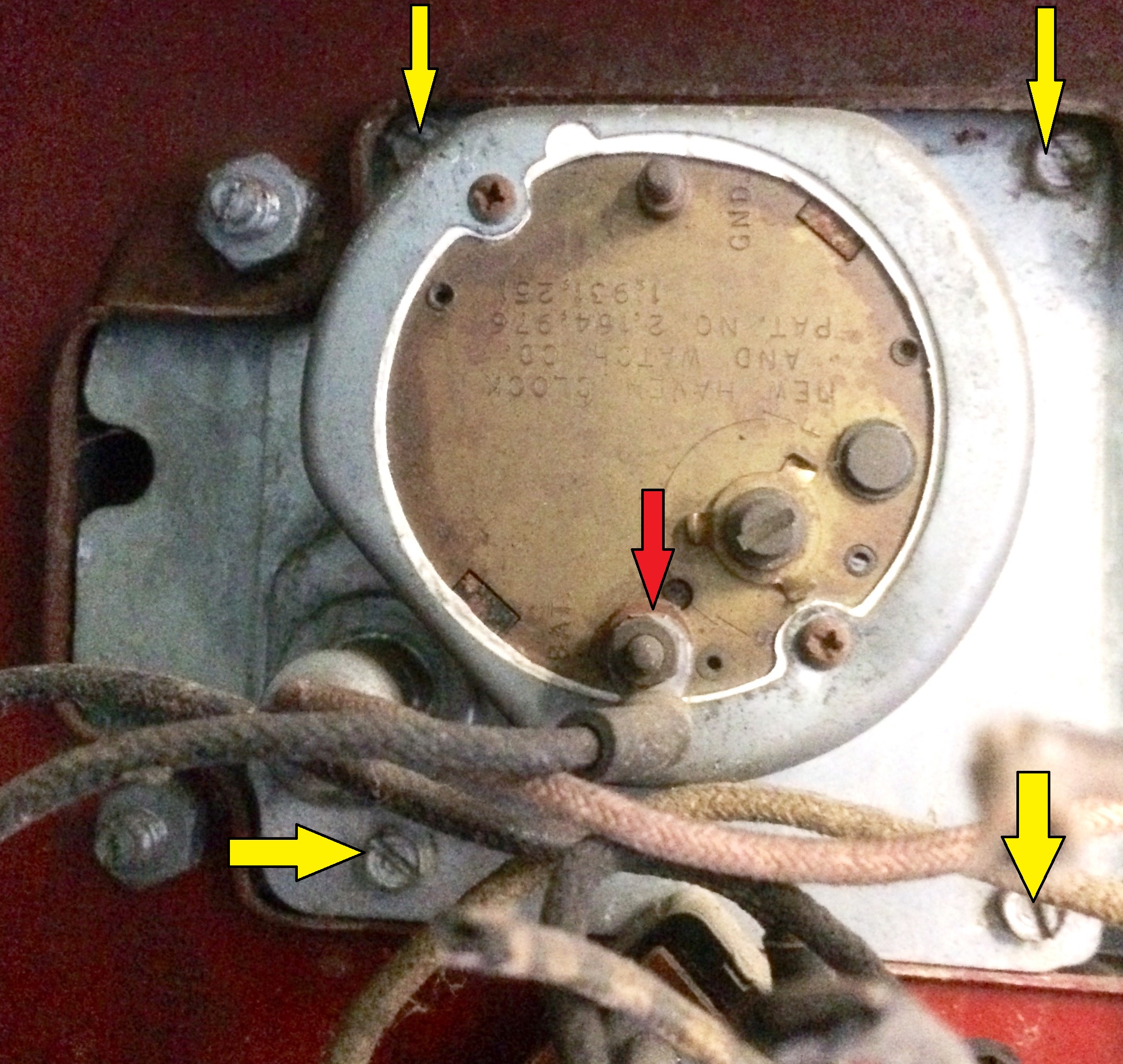 Picture of the clock from behind the dash. The yellow arrows point to the screws which hold the clock to the insturment cluster and the red arrow points to the input power which should be 6 volts. The clock power is fused and it recieves it's power from the "B" termnal of the light swtich circuit breaker.