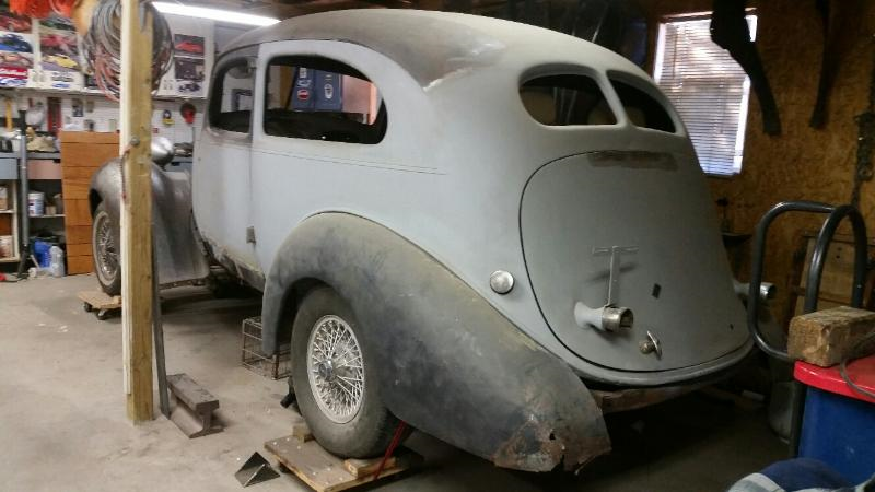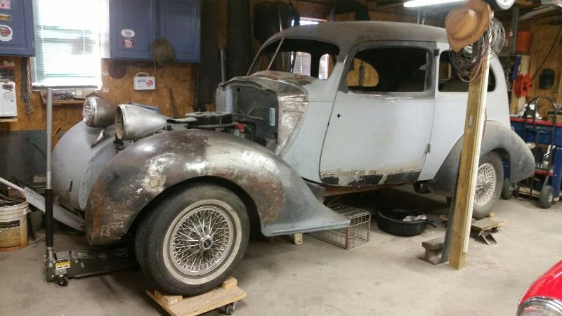 Wayne from Belen, NM. I'm building a '36 Terraplane 2-door sedan, 283 Chevy, 700R4 trans, (honestly) '76 Toyota pickup cross member, '81 Toyota pickup rear end, '84 Lincoln aluminum wheels with wire spokes, '86 Cavalier R&P steering, '85 S-10 steering column (from a manual trans pickup). Still working on body, need master cylinder, interior, glass.