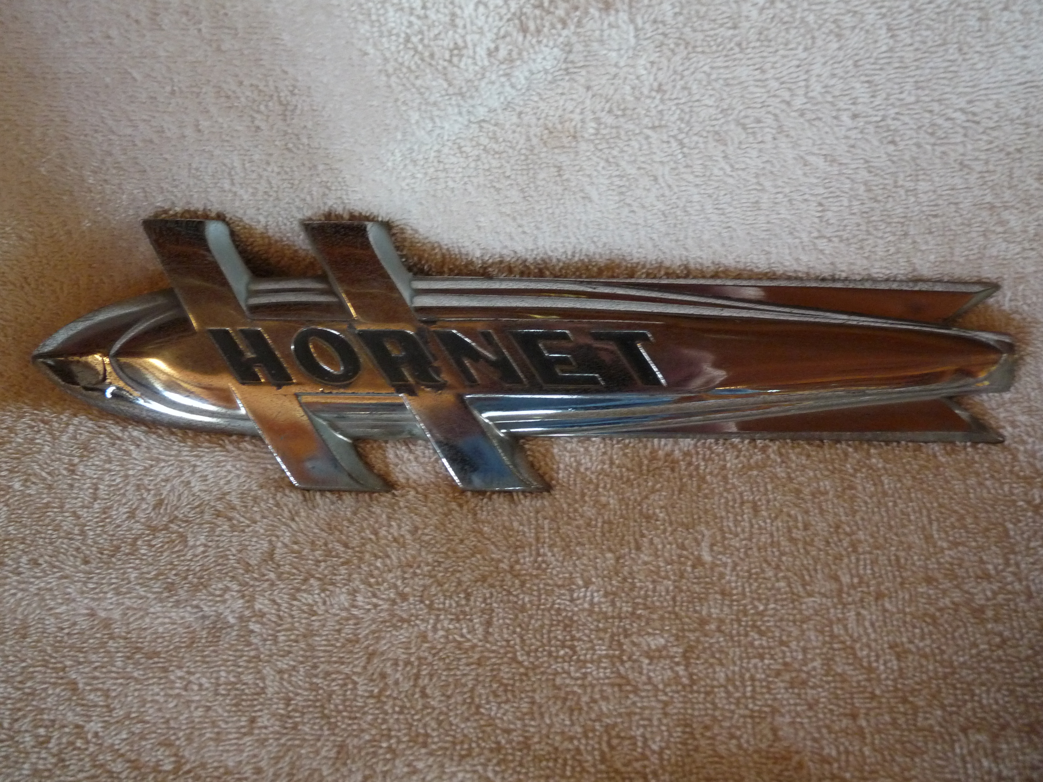 Hood ornament is clean with very minor pitting,$100 The Hornet plate is clean,no pits,but need re-chrome,$50 or make an offer.