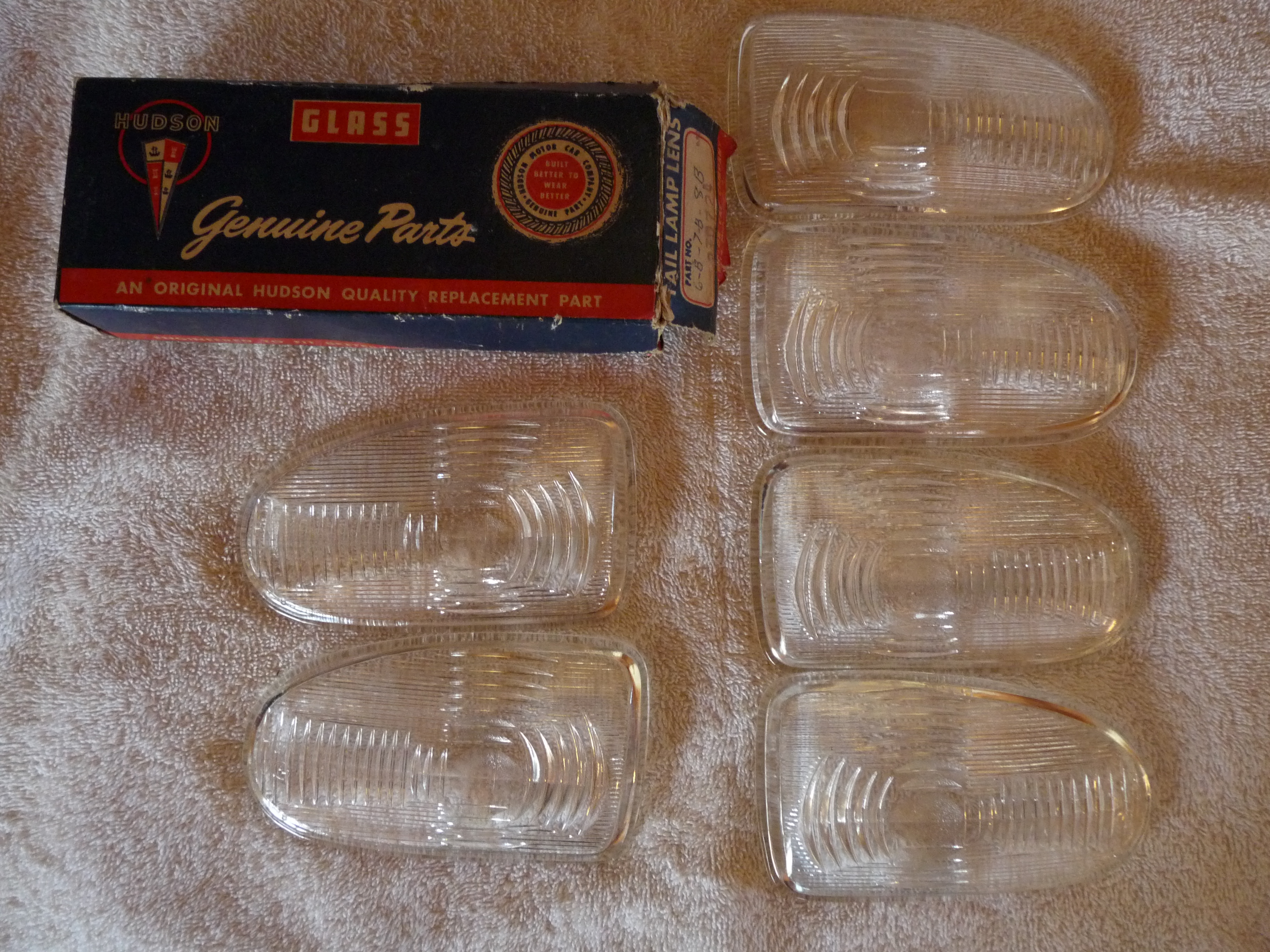 Glass front parking light lens,in 1952 a limited number of 6B,7B,and 8B models where equipped with parking lamp assemblies made by stamping,these use a glass lens.Cast assemblies use a plastic lens.I have one right new with box,Hudson part number 230724 $25,one right and four lefts $15 each.