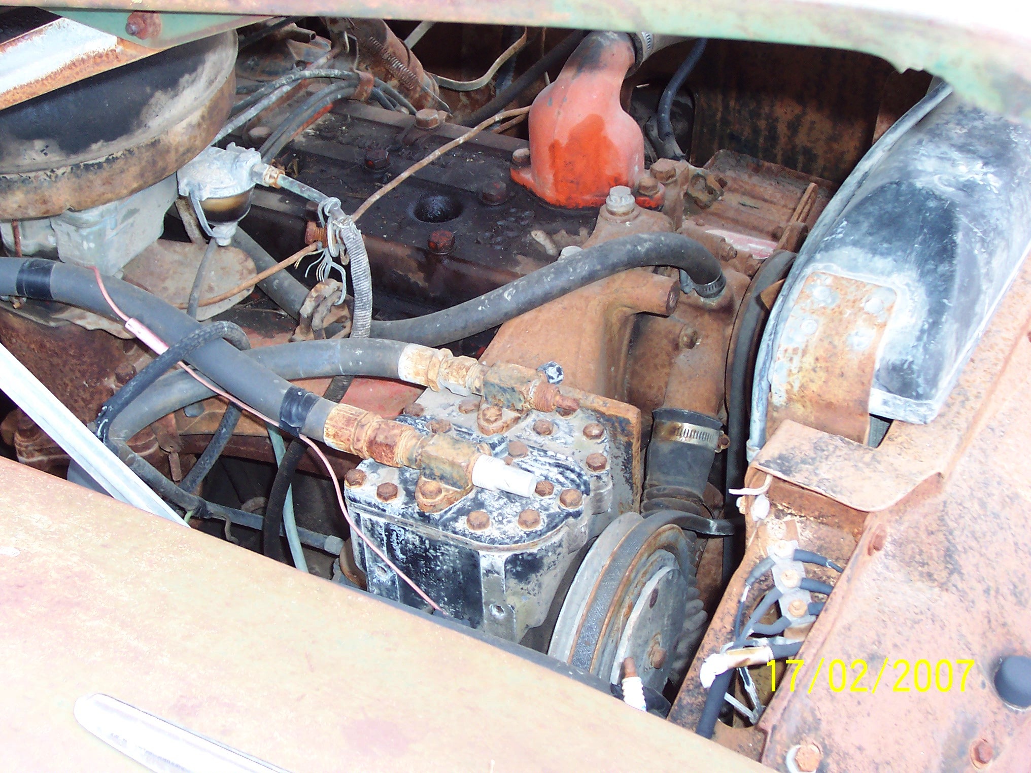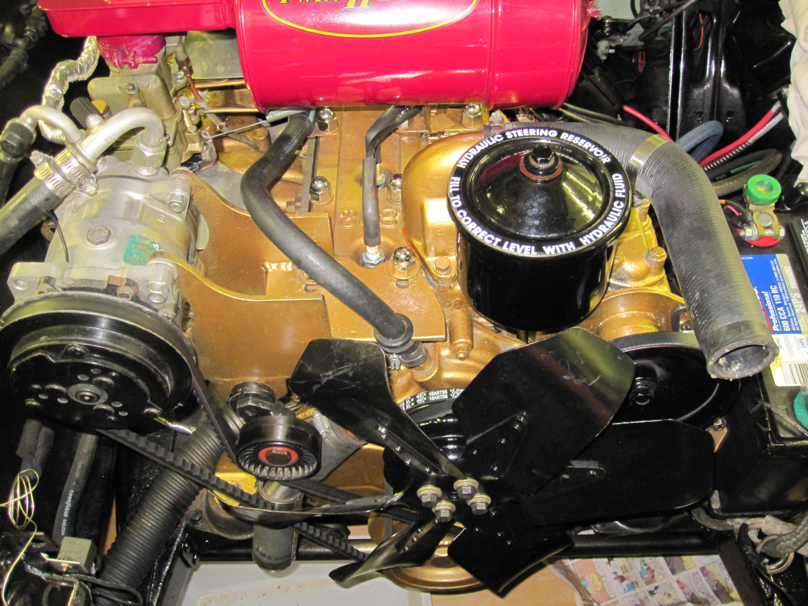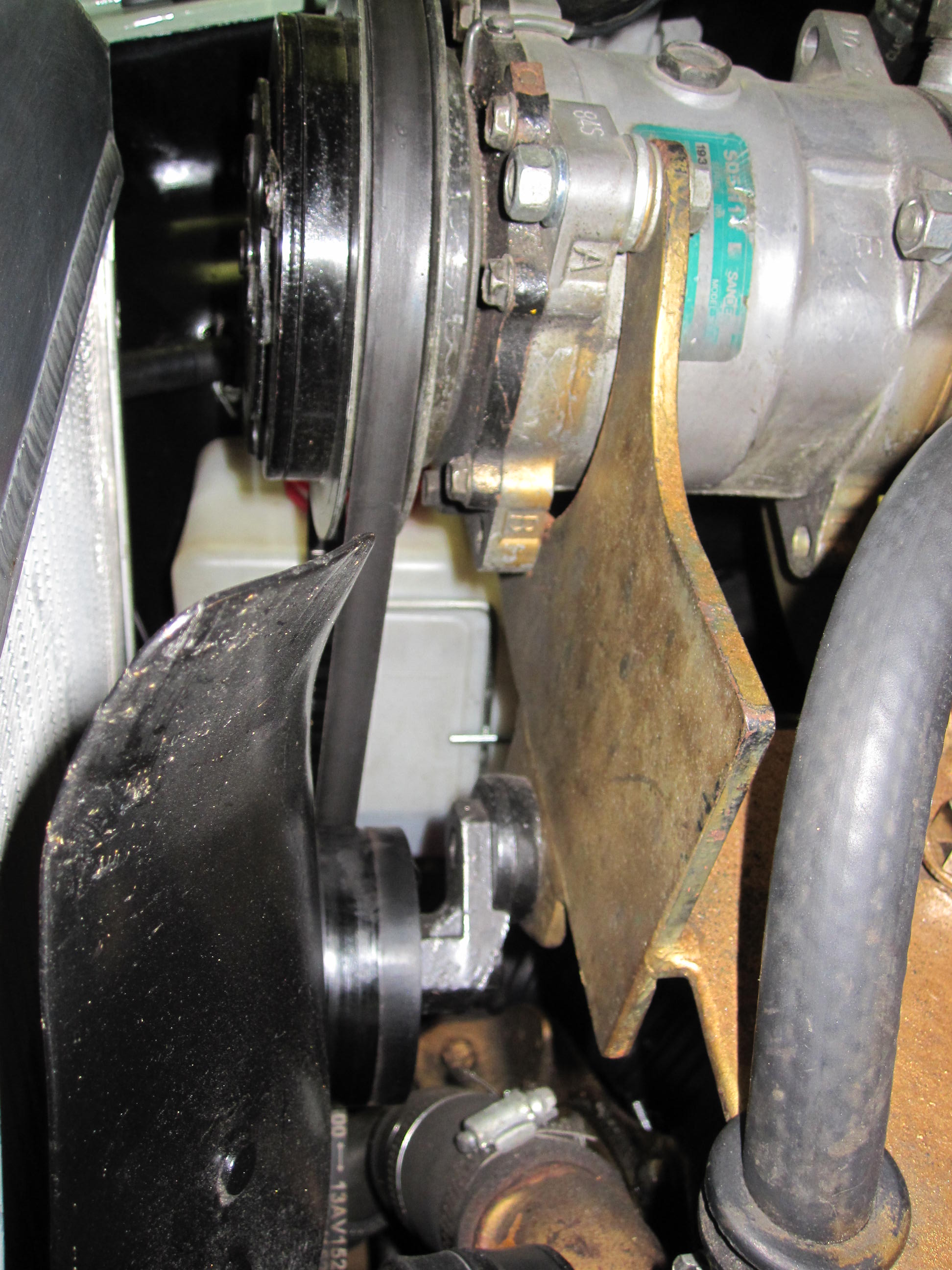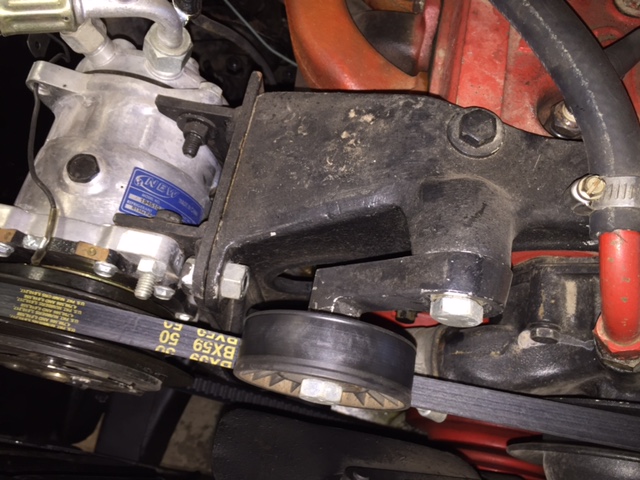 Adding the pictures of an installation with OEM brackets (same as Stineett replicated) System uses, wide pulley on the compressor and the altenator and one wide belt to drive all accessories.