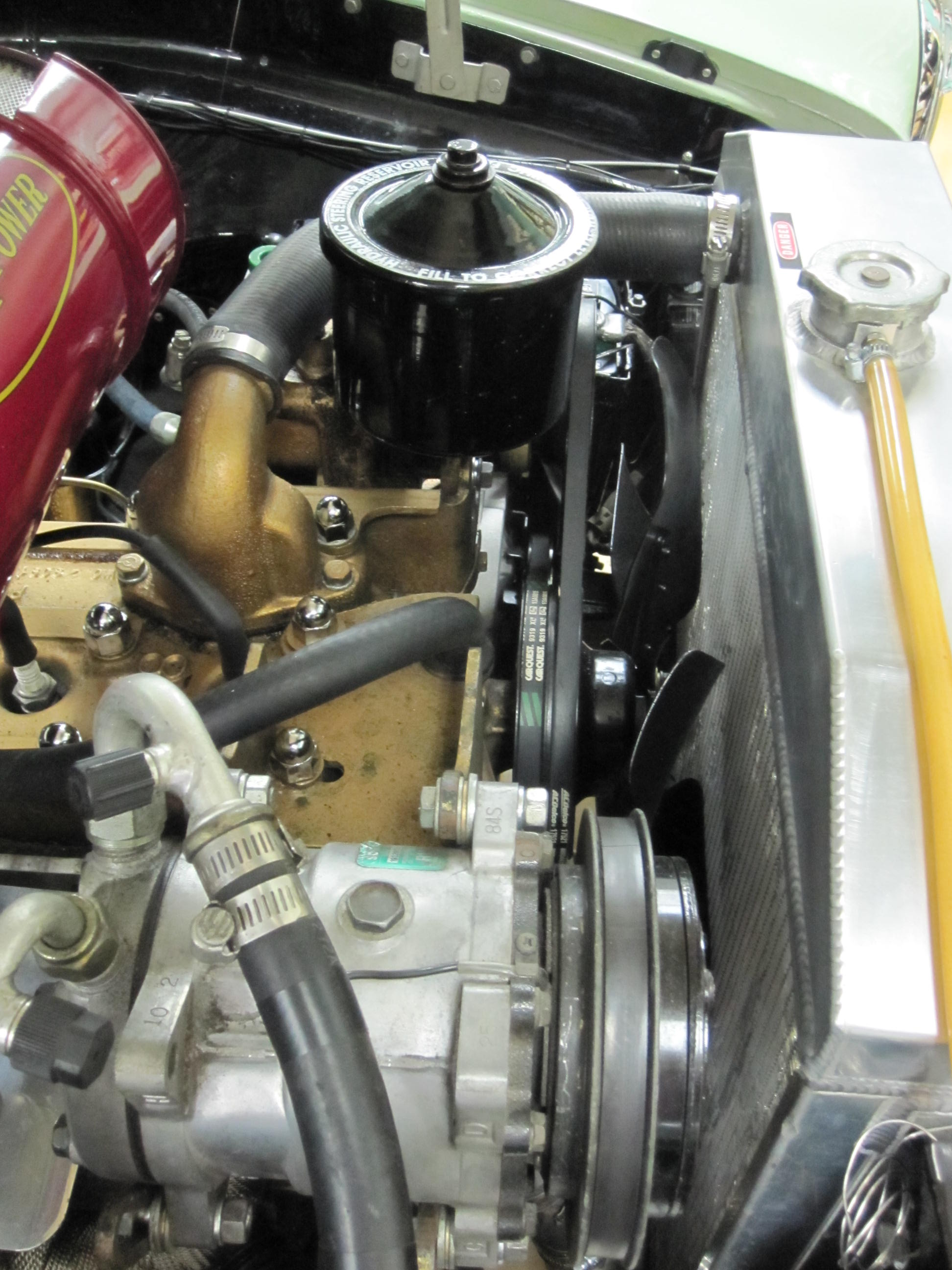 More: A/C uses front groove on double crank pulley. Back groove on crank pulley goes to water pump and power steering; back groove on water pump pulley goes to alternator. But had to weld 2 five inch water pump pulleys together(Ford 6 cyl.; after cutting, etc.) to get water flow rate up to design. Had to line up grooves with PS, CP, & Alt.