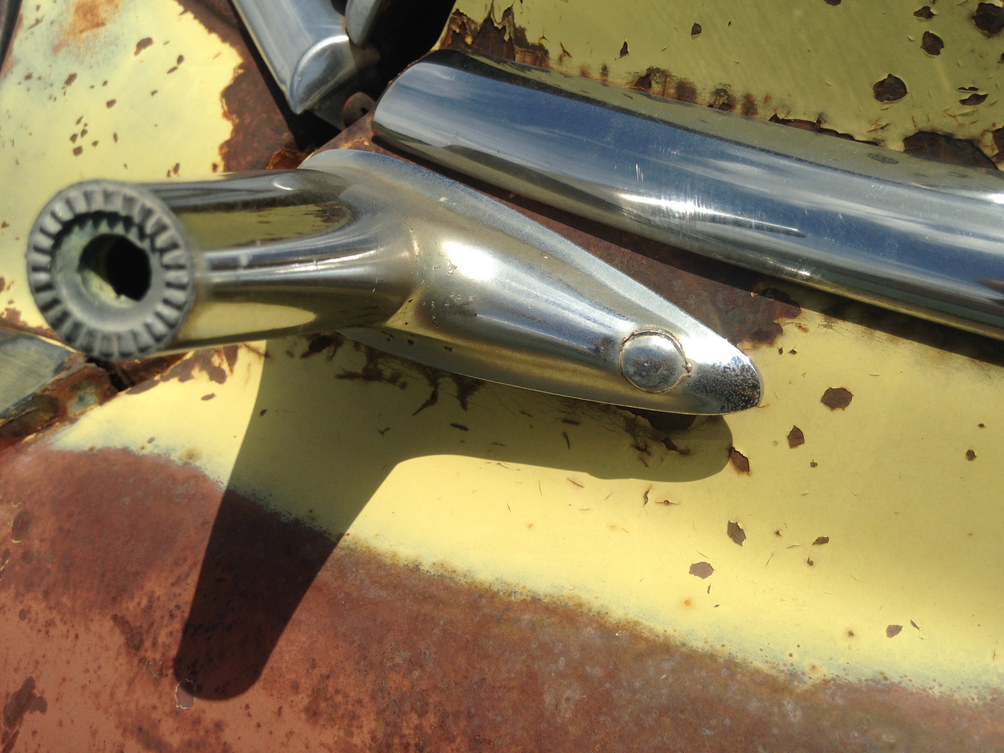 Attached are some examples of Hudson mirrors that have the rear screw holding the mirror to the door. The screw hole is then filled with some type of metal or solder to give it a somewhat smooth look. My question is, How do I remove that solder or metal filling to get the screw out? I have a set of good mirrors that I would like to remove from the car and rechrome and fix the mirror glass. I have 3 of these broken mirror brackets, like in the pictures, and they all have that filling in the screw hole, and a good pair on the car with the filling. What does a guy do?