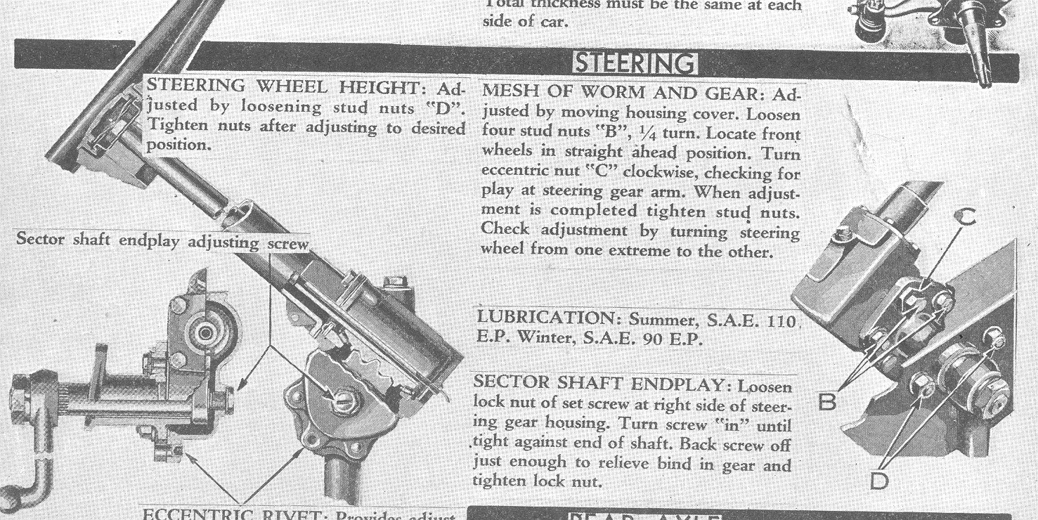 Well, now the plot thickens. Turns out that there are instructions for moving the steering wheel up or down on my 36 Terraplane. In the repair and tune-up manual, are the following instructions. There is room on the pre-stepdowns to move the steering box up by drilling new holes in the frame to clear stepdown eights and big sixes as well.0