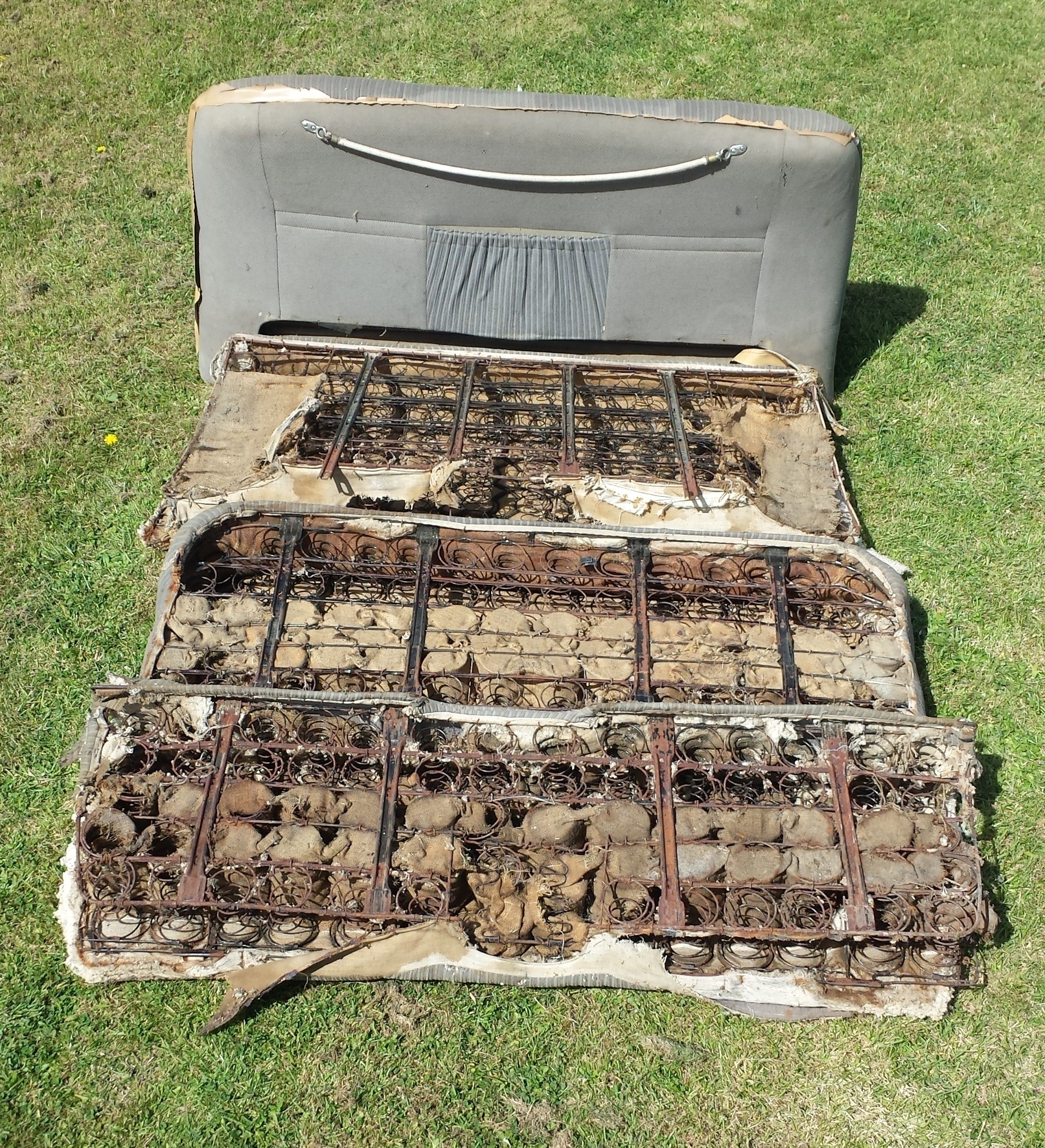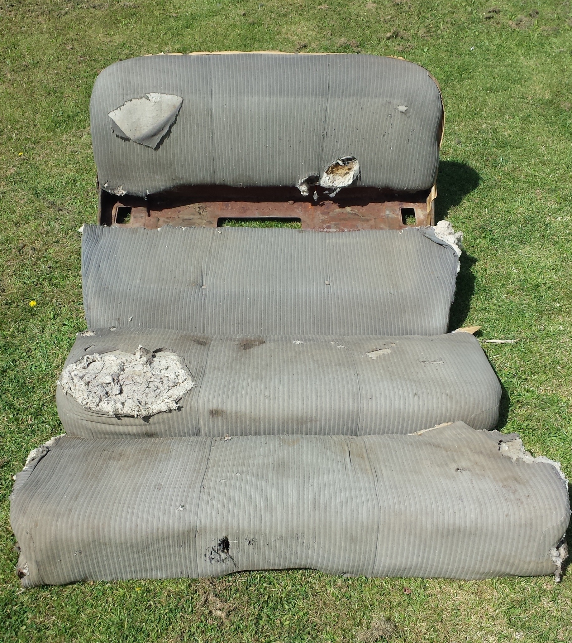 Missus cleaned up the old seats. Vacuumed out most of the old rat turds, walnuts, nests and filler from the underside of the seats.