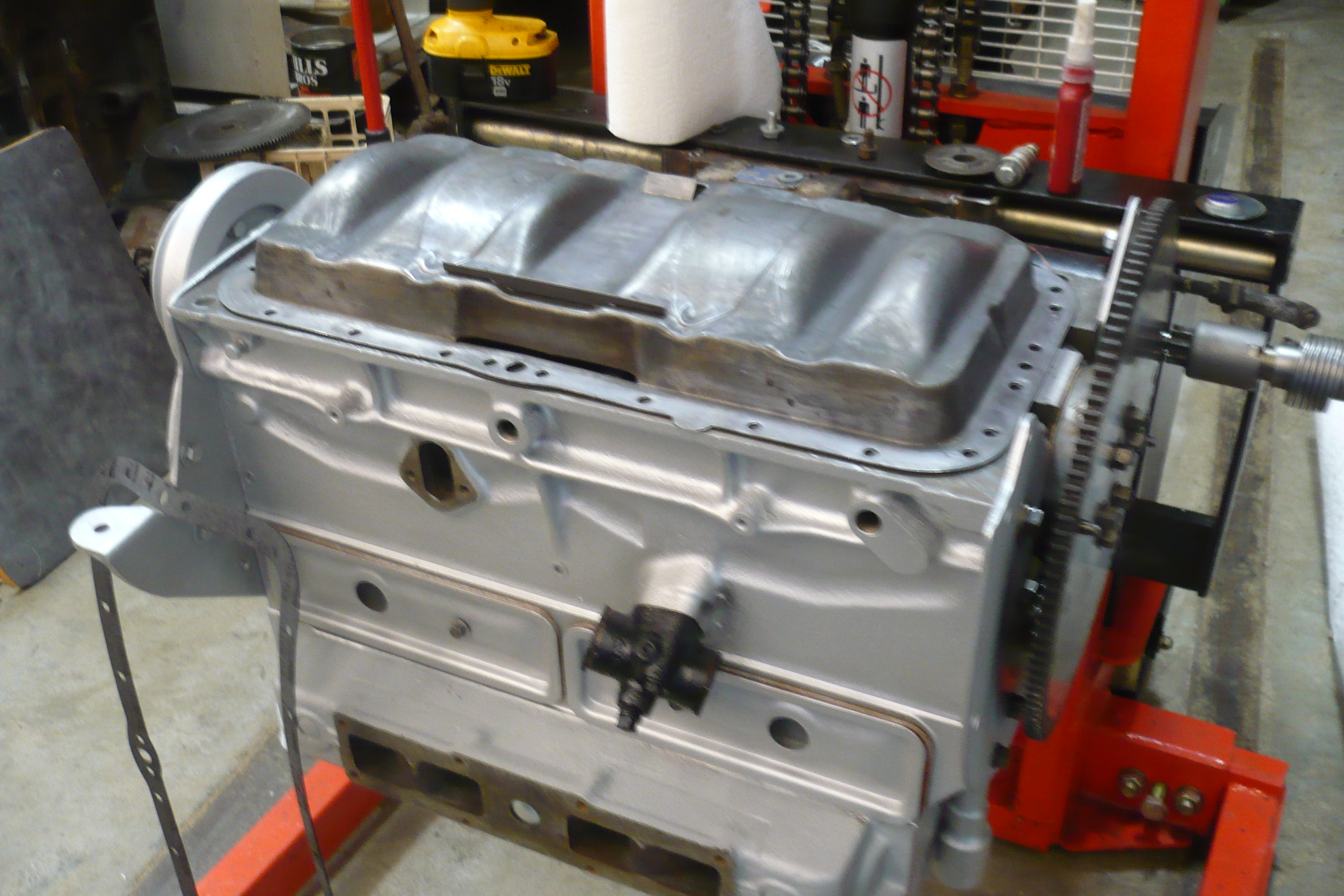 • For what it's worth, I wouldn't risk the mess trying to install the pan/tray assembly with oil in it.....I know what would happen. Install it dry, then pour a couple of quarts of oil into the tappet chambers, one front, one rear. It will drain into the tray through the chamber-floor drains and fill the tray. It will also run onto the cam and down the crankcase wall into the main/cam brg. feed troughs. I have "installed" all of the required oil volume by this method but it overfills the tray by about 2 quarts (in a six). I'm sure it would reach equilibrium with the reservoir level in short order after initial start-up but I've changed my approach to just 2 quarts.