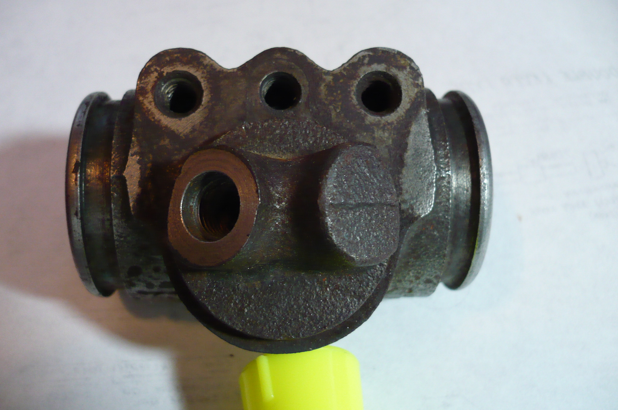 Rear is a similar story and there is a replacement available but, again, keep a firm grip on your pistons and boots because the new one (NAPA 36029) is designed for a brake using "shoe links" so the boot is different from the Jet, which has the shoe-end bearing directly on the steel button pressed into the Aluminum piston. The boot is NAPA UP 5994 in case you need to replace yours. The new rear cyl. will not have the correct piston but the machined casting is identical.