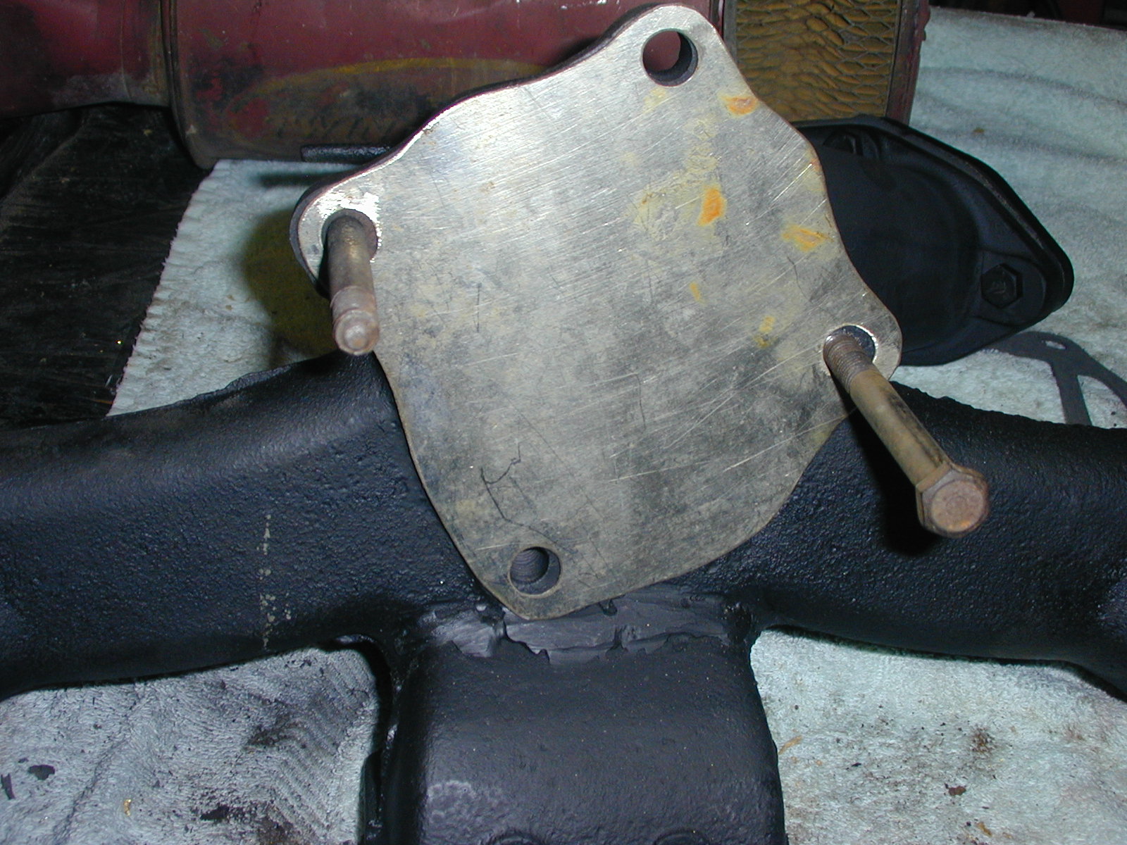 I had to replace one stud with a bolt due to the lack of room to start a nut on the stud with the adapter in place. just drilled the threads out of the original manifold and dropped a bolt in. I also made a stainless shield to keep the exhaust out of the intake. I also removed the heat riser flapper and filled the holes with a couple short bolts. Adapter flange is at the welding shop. I decided to let the pro do the welding. I am going to use 1 7/8 exhaust pipe. It's only a 262 so I don't think dropping 1/8 ' is going to make any significant difference. I am going for the "sound" not performance. Maybe snakeing 1 7/8 pipe through the cross members will be a little easier than 2". Any suggestions on muffler choices? It's a '49 so has more room next to the fuel tank than the 51 and newer.0
