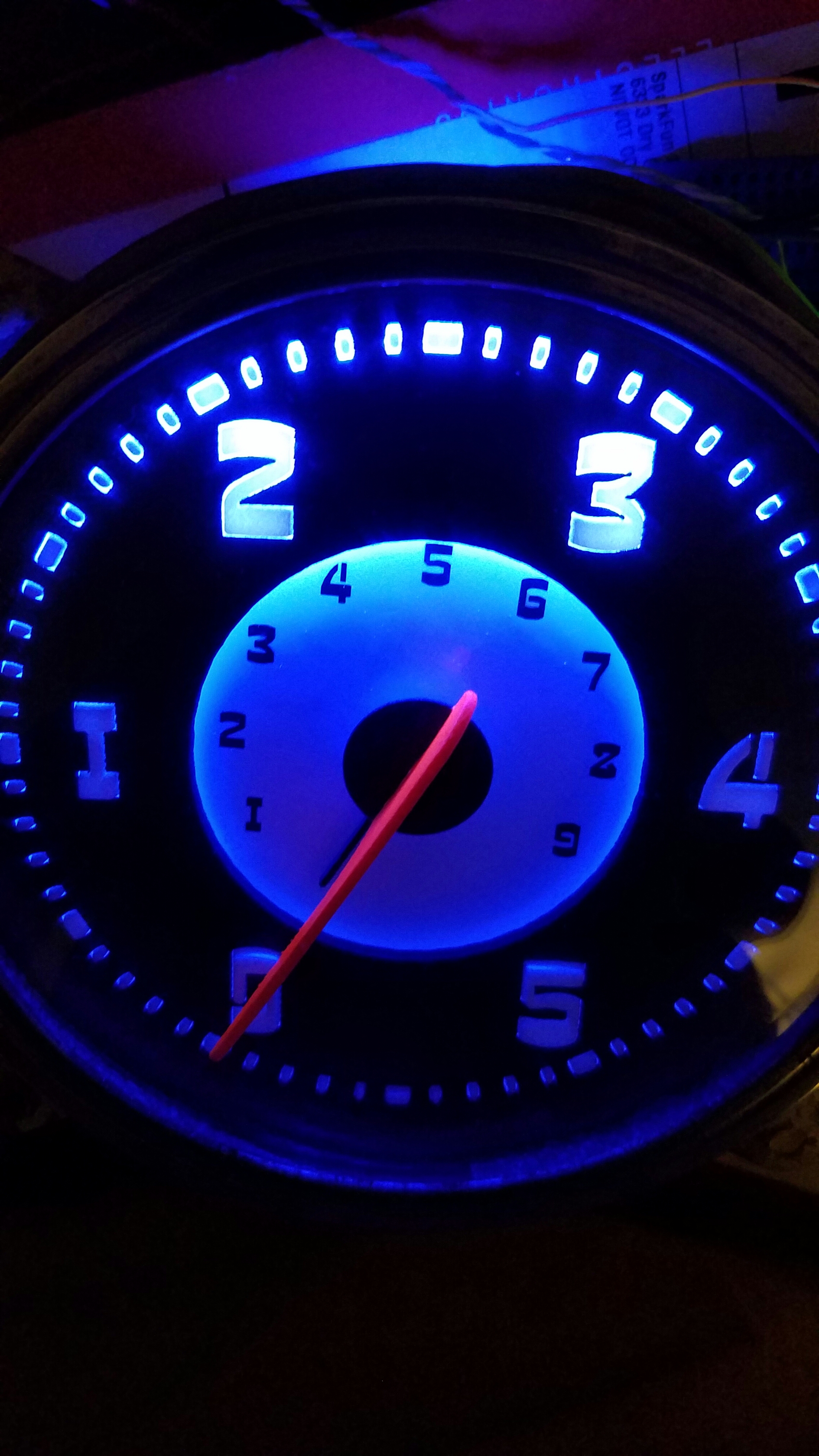 Pretty proud of this B) ...  Just got some florescent gauge needle paint, really makes the needle pop out with just blue LEDS. Tach is the outer scale, speed will be the inner scale.