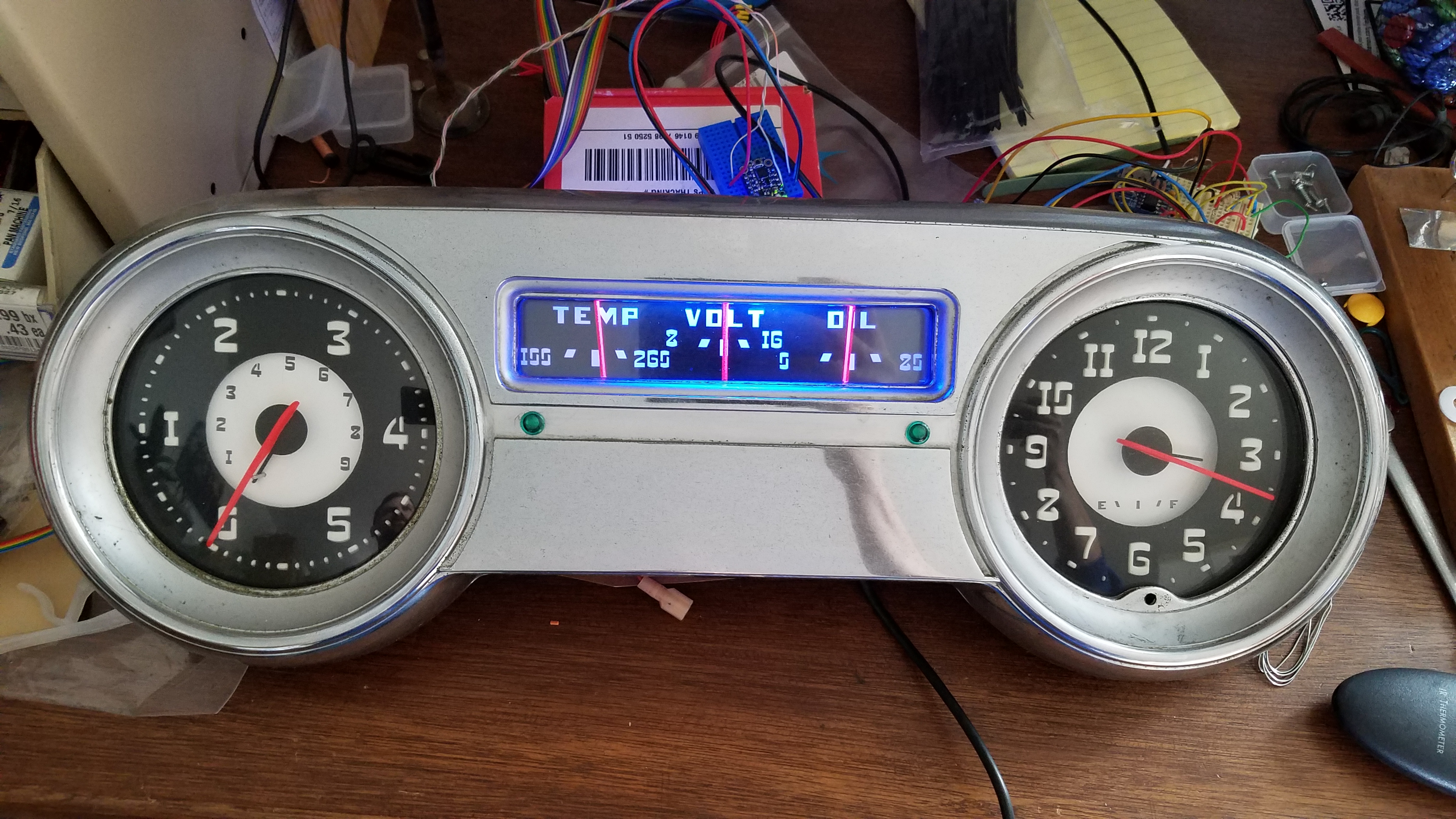 I am using a couple small gauge steppers, one a clock movement and one a 315deg gauge movement ( they'll be another needle for fuel when complete).  The gauge movements are ones used in many models of GM vehicles (many kits available to fix GM clusters, search for "X27 stepper motors").  The clock is a model X10, from the same "family" of steppers (the tach/speedo use a X40, co-axial dual-motor model).  Not as easy to find though, but I was able to get a couple "samples".  I'm running a small Arduino micro controller to read the fuel signal and control the steppers and a Real Time Clock module to track the time.  Hands, faces, internals are all 3D printed parts.