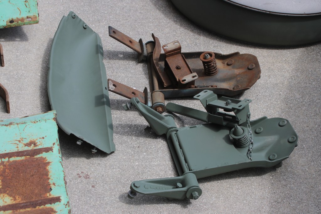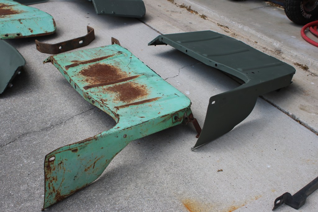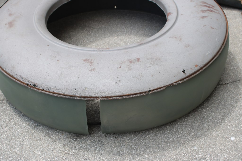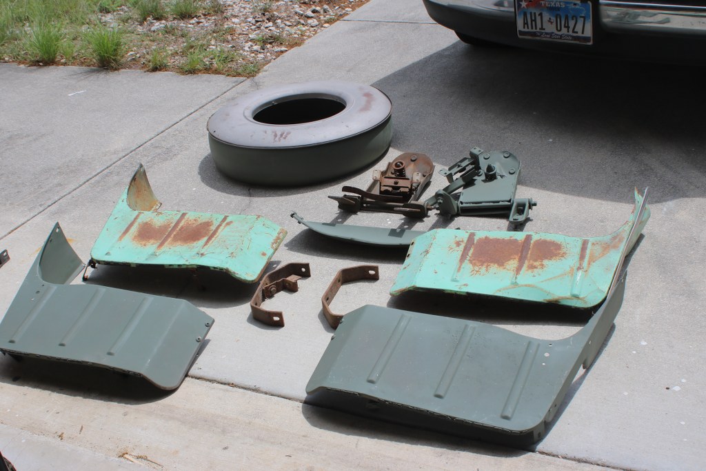 You'll notice that there are 2 sets of pans that go on either side of the "well". Years ago I had beadblasted the dark green set and primed them for final bodywork later. They are actually pretty good, but on the close-up of one of them you can see that it is pitted. I had planned on just leading that in when I did the final bodywork. The set that is not bead-blasted is not pitted, but are bent a little and require massaging back into shape. Also, you can see some rot on the bottom of the outer 'O' cover. That was the part that was down obviously back when this kit was being used. Water collects between the spare tire and the inside of the cover, eventually causing it to rust and, later to rot out. This will take a little work to fix by someone. My plan was to cut a metal strip, weld it to the inside and lead in the holes. The outer edge that holds the WTSP (weather-stripping) needs some special attention, though. I tried to get a close-up of that so you could see it.