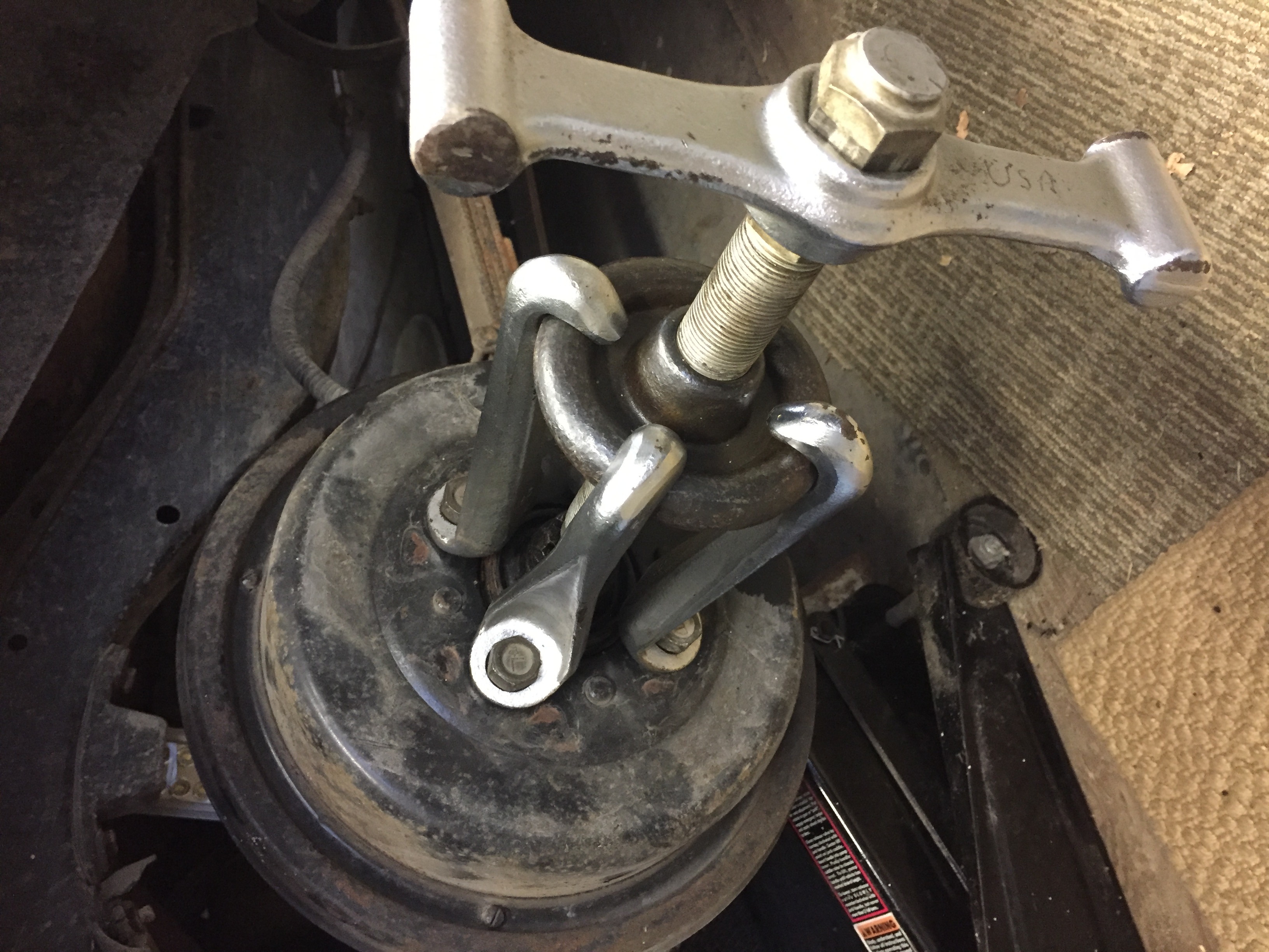 I test fit this puller that I bought a few years ago from another club member. What do you think. I looks like it may have been intended for a hub with a bigger bolt pattern.  The feet don't sit quite flush on the drum. I take it you want the bolts as tight as you can get them.  I'm nervous about torquing the bolts and bending them.
