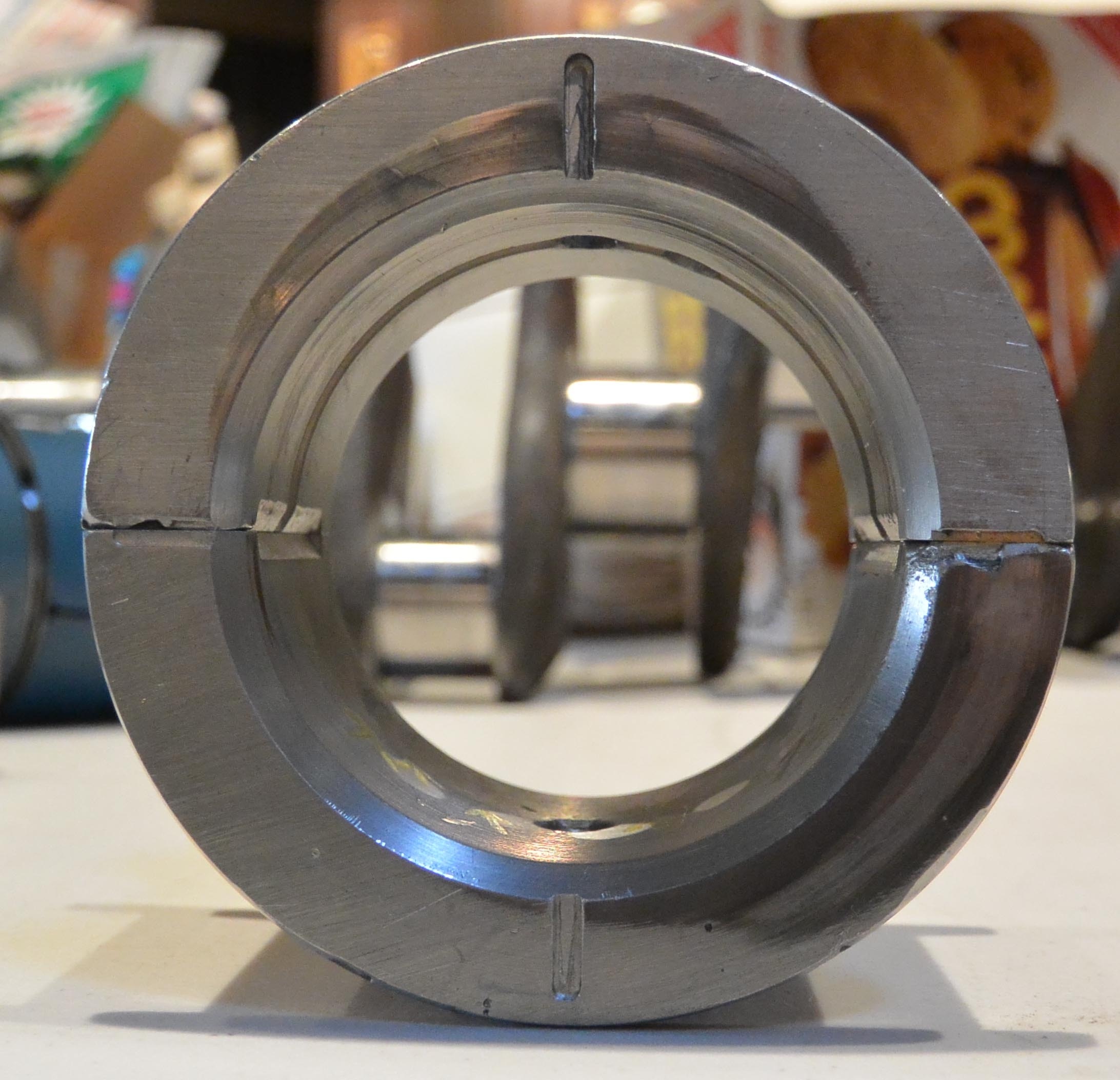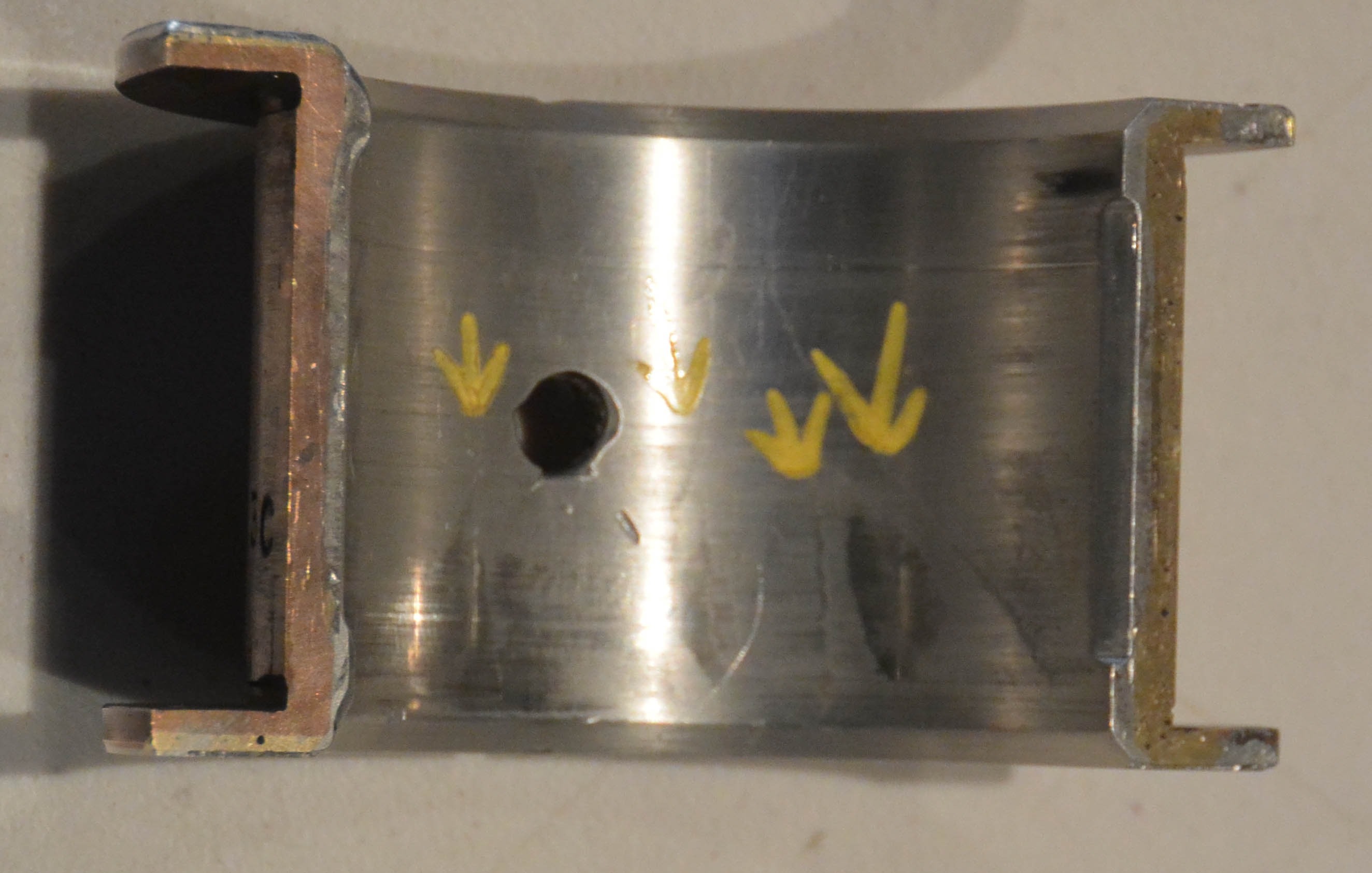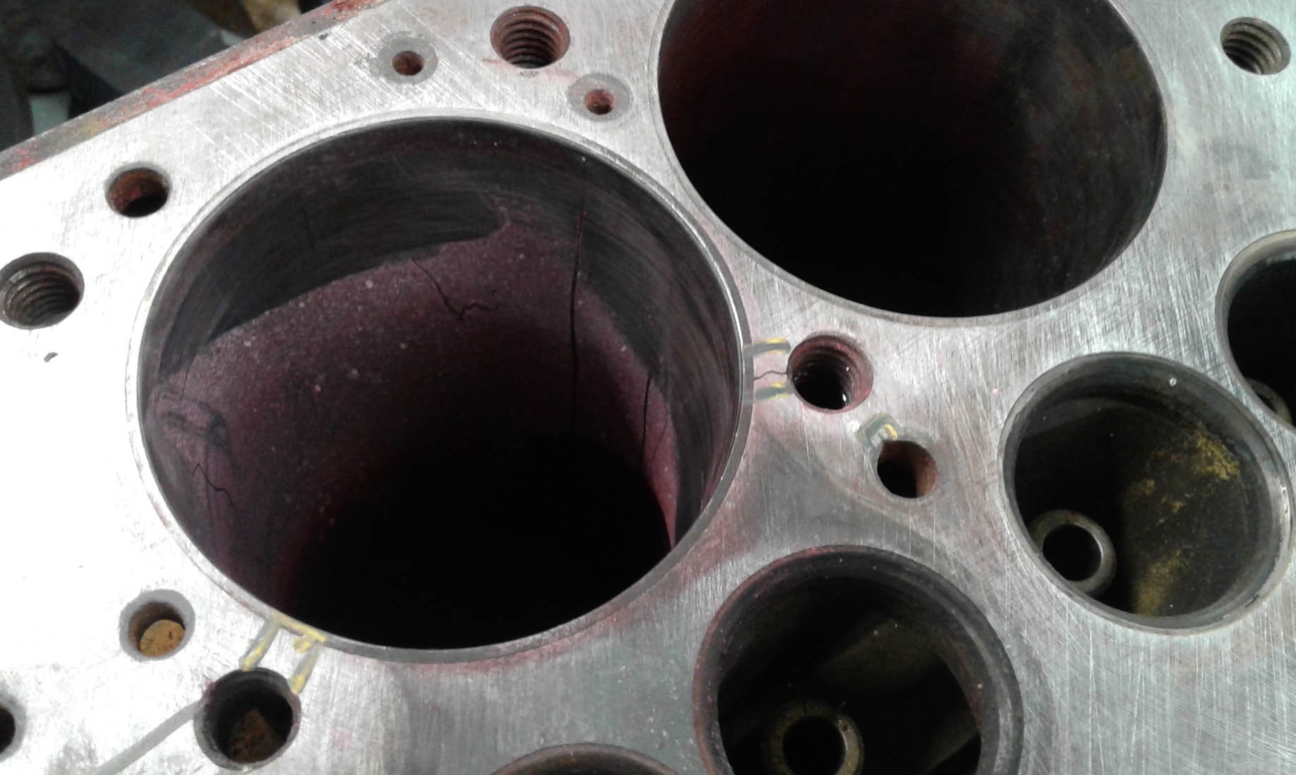 The rebuilt engine then did 1500 miles before it started to overheat. stripped down and discovered cracks to stud holes adjacent No 04 cylinder. Also found bearings by second engine man now failing, cracks and drag marks despite 2 thou clearance to journals. Also discovered that the second engine man did not clean up the bores from first persons efforts, Now none are both round and parallel, up to 5 thou out of round and others which are close to circular are similar amount tapered.