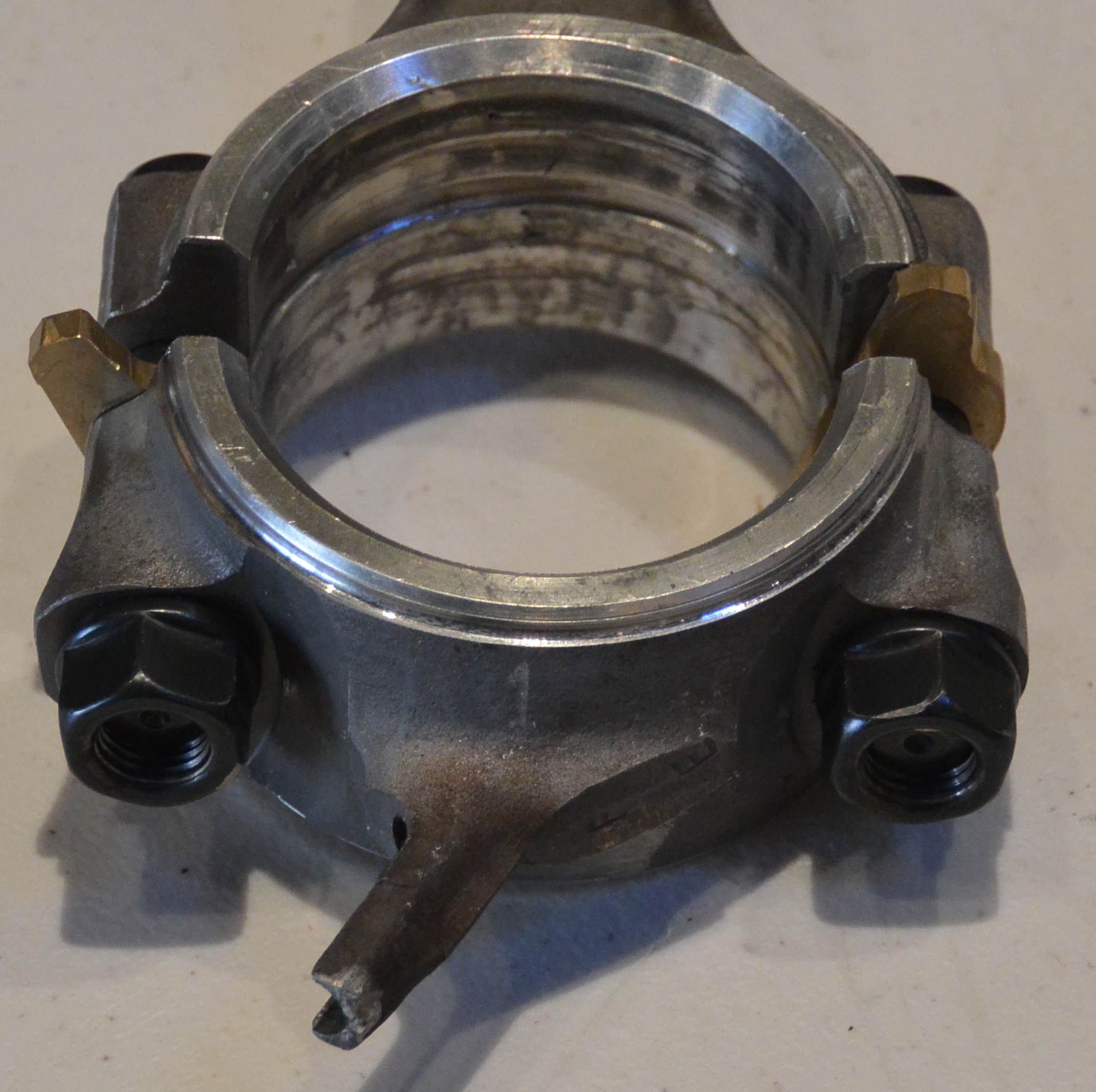Several things - your block has been bored out and sleeved. This boring out has weakened the block, leaving it without the structural integrity to take the strain of tightening the head down. I'm afraid this will be a write-off. My recommendation, if sleeving is to go down a size, to either 2-7/8 or 2-15/16, which will leave enough metal for the block to take a few strains. The connect rod bearings have a groove right around, and a solid shim. This does not permit the oil to circulate enough for adequate cooling, hence overheating and fretting. Likewise the main bearings. There must be a good flow of oil through the bearings, the more the better. The con rods should have a good wide groove in the bottom half only, right around the half circle, and a good gap between the shims and the journal for the oil to freely circulate. The main bearings should have a groove in the top half only, and likewise a good gap for the oil to flow out the sides. 1 to 1.5" clearance is adequate clearance for all bearings and pistons.