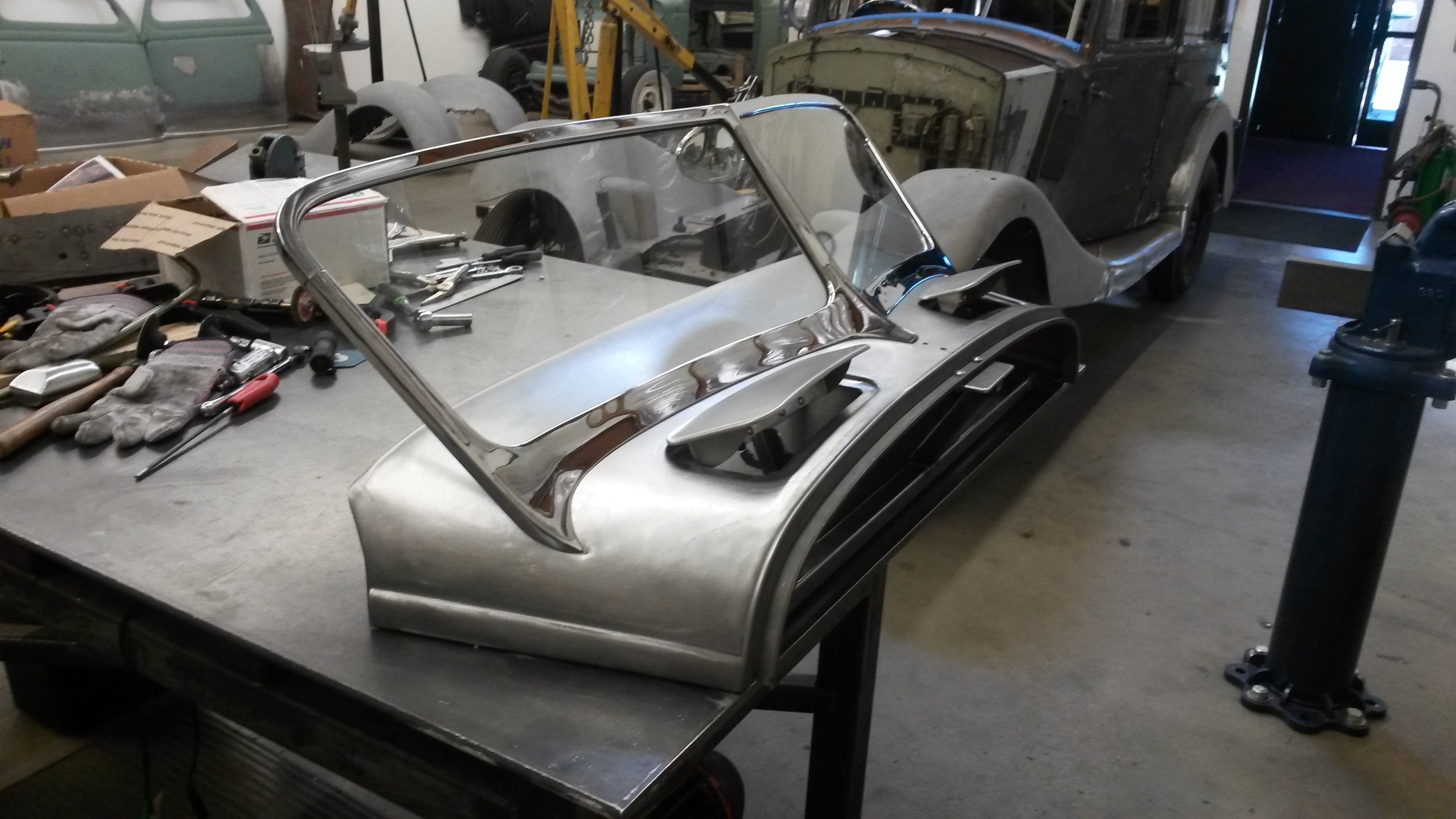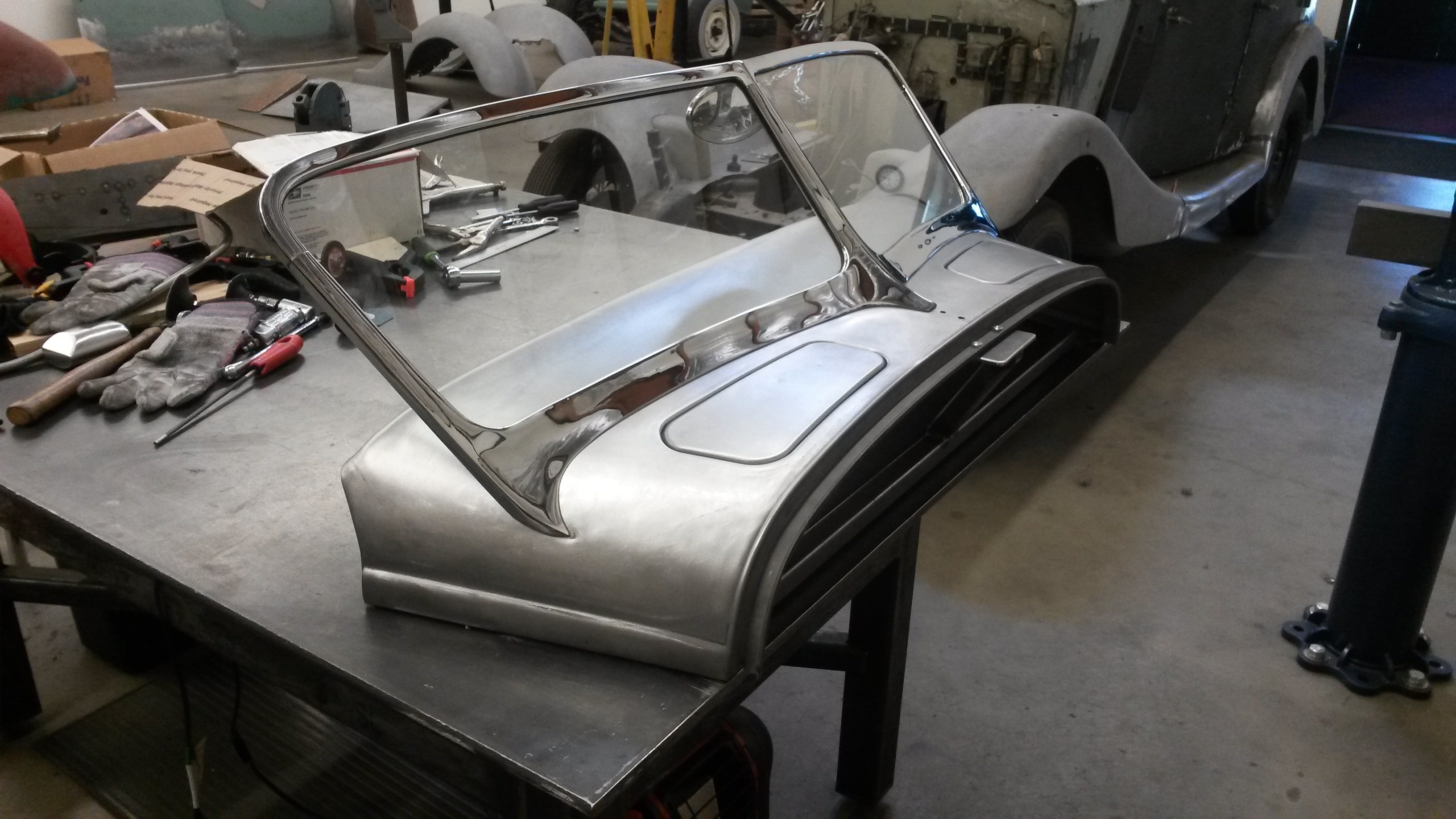 The windshield was custom and vents were made by someone else. I think the vents came from that famous coach builder in San Fransico, his name escapes me now. But they were a in kit form. I had to make a new sheet metal top so the windshield would fit down tight, and then made the vents fit the contours of the new top. 0 -