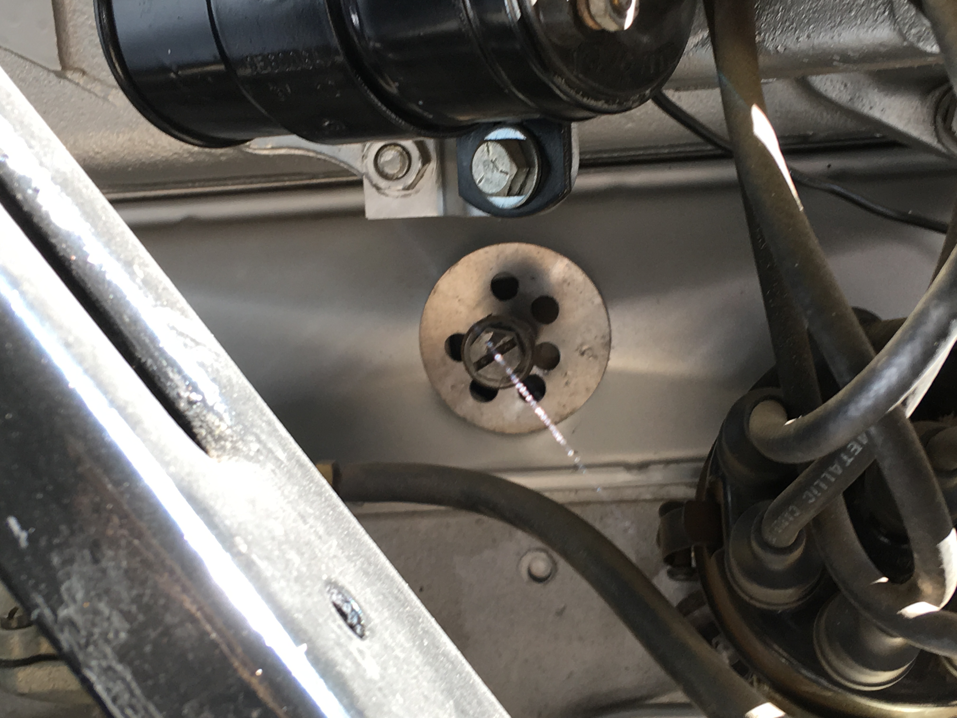 On the carburetor side (right) side, barely visible below the coil is a mysterious looking opening that looks like it needs some kind of a cover. I have a couple of photos, it shows up right under and to the left of the coil, and up close in the 2nd shot.