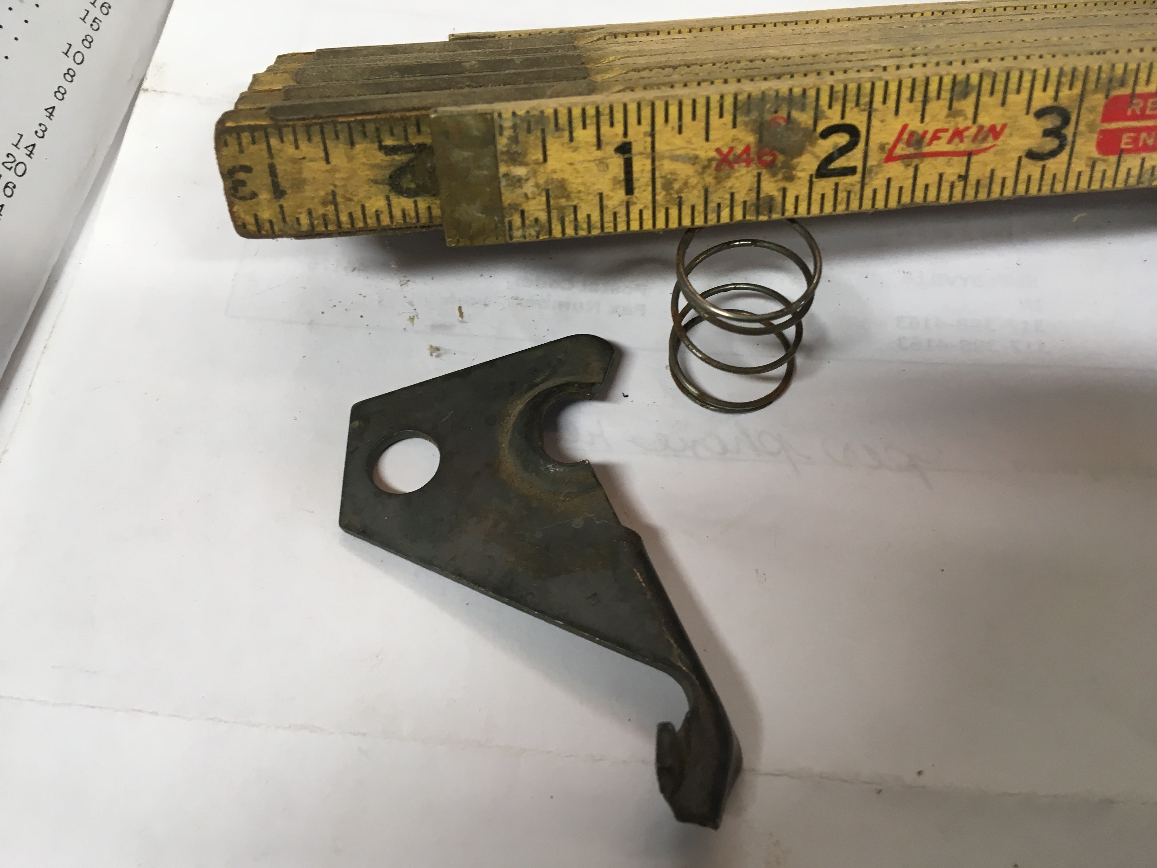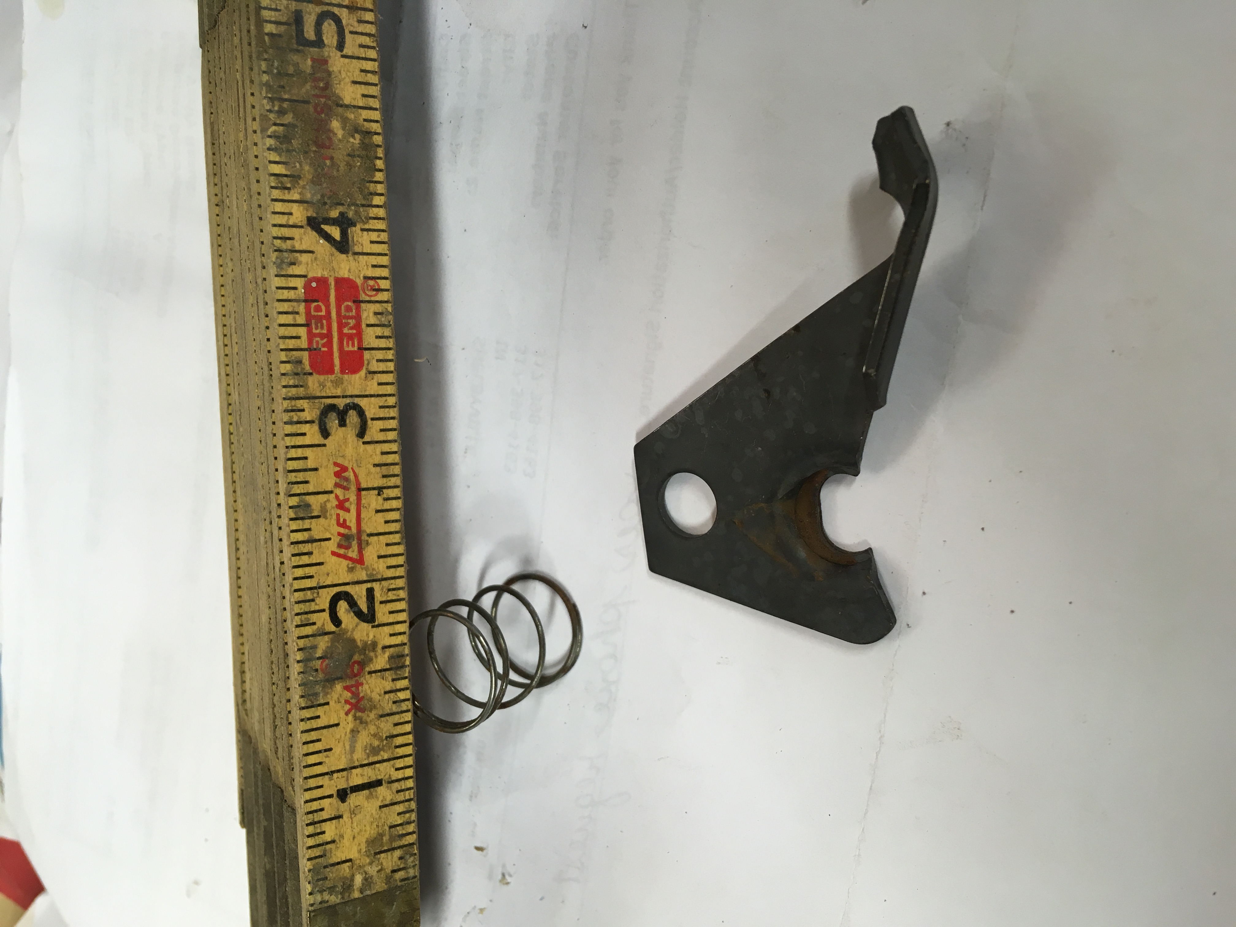 Spring looks like window crank or door handle esucheon spring. Bracket is half of a piece that mounts at front and below center