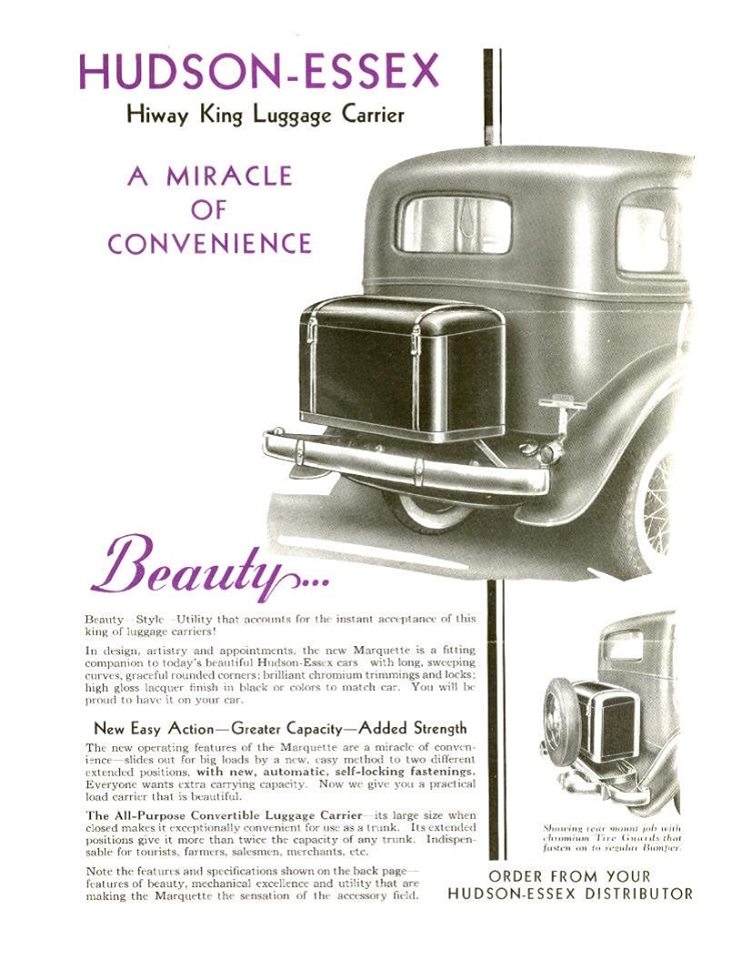 Greetings, HET fans, I was raised restoring old Fords, mostly Model As, but we did build one Model B roadster. Now I am passing the tradition down to my son by helping him build his first car. We are heavily modifying a VW based Gazelle Mercedes SSK replica roadster that he found on line. My first car was a 68 bug that my dad and I restored and I always wanted to build a kit car. Long story short, we were looking for an old 20s-30s removable trunk to serve as an engine cover. I found one and took a chance on it, but it turned out to be too nice. The restorer in me won't let me just chop it up without first determining if it might be that one rare piece that some enthusiast is hoping to find. I did a quick online search and found out that this Marquette Hiway King was a dealership option on Hudson and Essex in the 1930-33 range. WhenI picked it up (some nitwit had drilled through the sides and attached cheap door pulls) I noticed that it was a lot heavier than other similar trunks I've seen. Reading the literature I found online, it turns out that is because the whole front, bottom and sides are doubled up so that once the lid is opened, the whole front slides out and the trunk doubles it's capacity. Pretty nifty. Does anyone have an idea if these were exclusive to the HET marques? Also, what is the rarity/approximate value of this model? I apologize if that breaks any forum etiquette, but I would prefer to find something else for our project and save this piece for folks who own real collector cars.