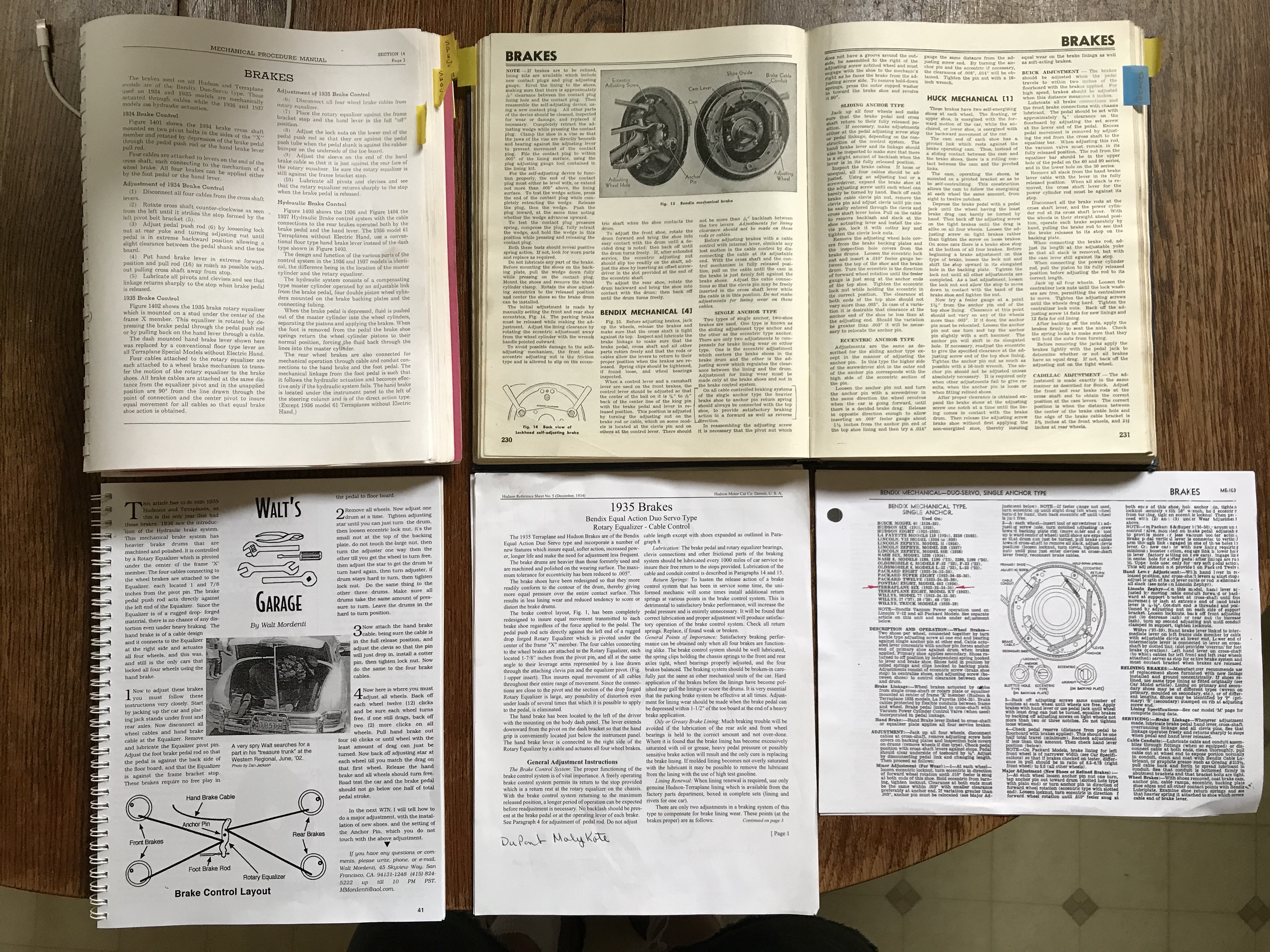 I know this thread is a bit old but having just gone through my 34 Terraplane brakes, here’s my suggestions: 1. Disconnect the cables as Geoff indicated. Lubricate liberally with grease in the flexible conduits by pulling them back and forth. Make sure they move freely so you have equal pressure at each wheel. 2. Remove, clean and lube your anchors and eccentrics on each wheel. 3. Clean and lube the brake shoe and mechanism friction points at each wheel. 4. Lube the center linkage with grease.