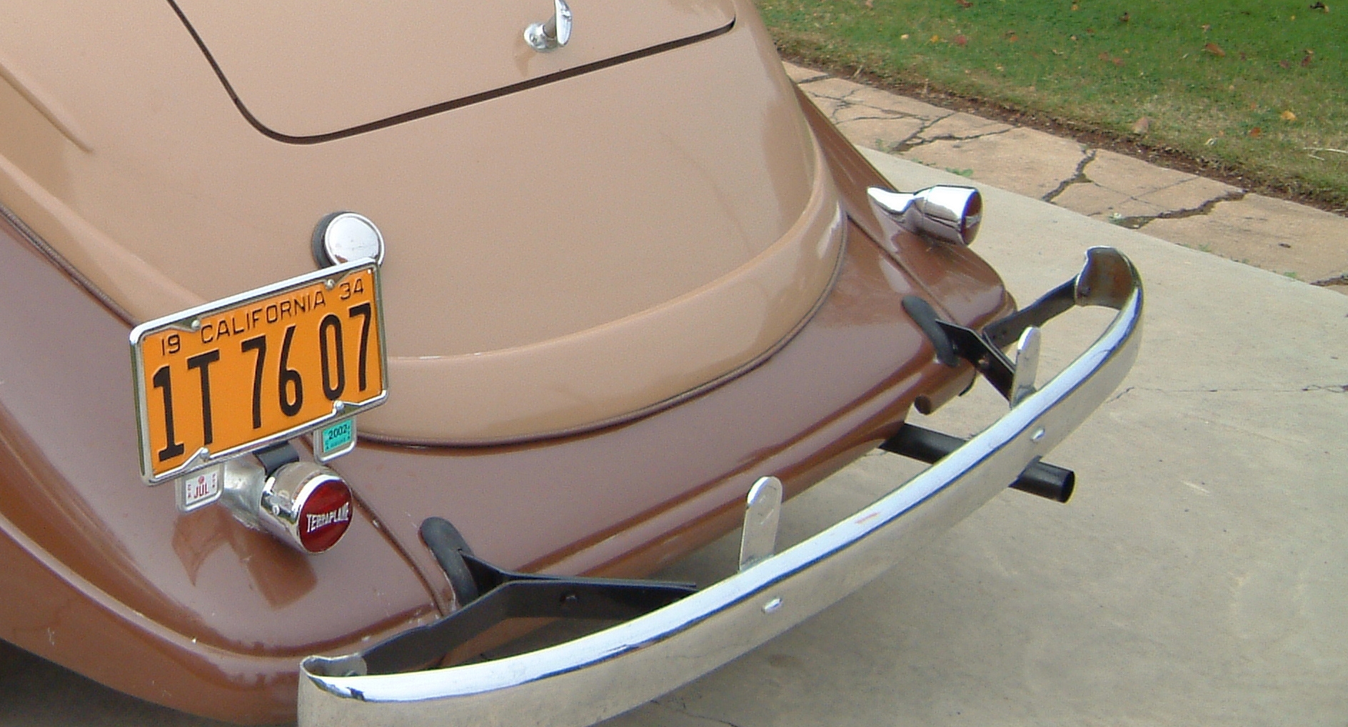 Trevor; you can see on the photo of 35 Hudson I posted that my 34 Terraplane next to it has the flat plate "guards" above the bumper with hexagons [I'll attach another view]. Yes the guards look to be factory and the hexagon is stamped in, cast in, or whatever. I see numerous other pictures on the internet of 34T with those "guards" in the rear.