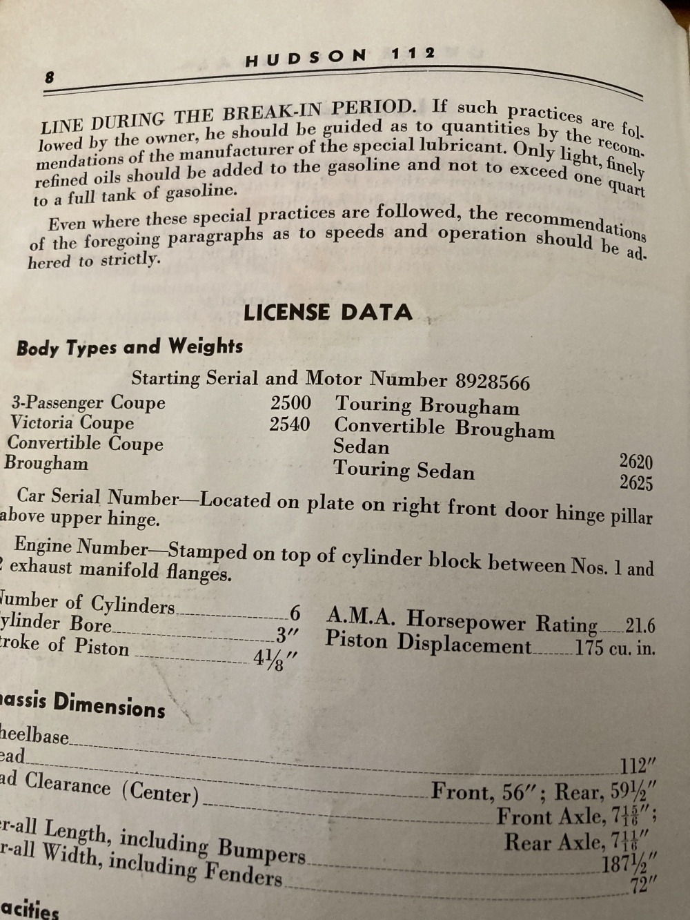 So "8928566" (the number you gave) indicates that the car bearing that number was a "112" (model 89), and it was the 28,465th Hudson product to roll off the assembly line during the 1938 run. (The 1938 sequence numbers began with #101, so deduct 101 from 28,566 (in your serial number) to get the true sequence number.